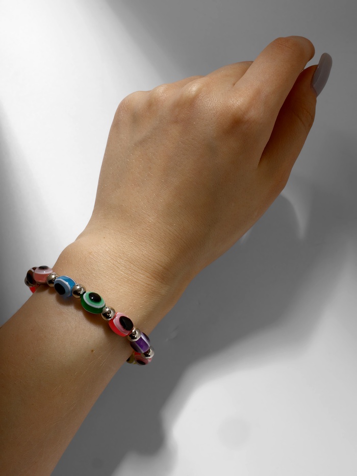 Погрузитесь в мир ярких эмоций и защиты с этим уникальным браслетом, который не только украсит ваш образ, но и станет мощным оберегом от сглаза. Разноцветные бусины, собранные в единую композицию, создают атмосферу радости и позитива, а серебряная фурнитура добавляет изысканности и стиля.