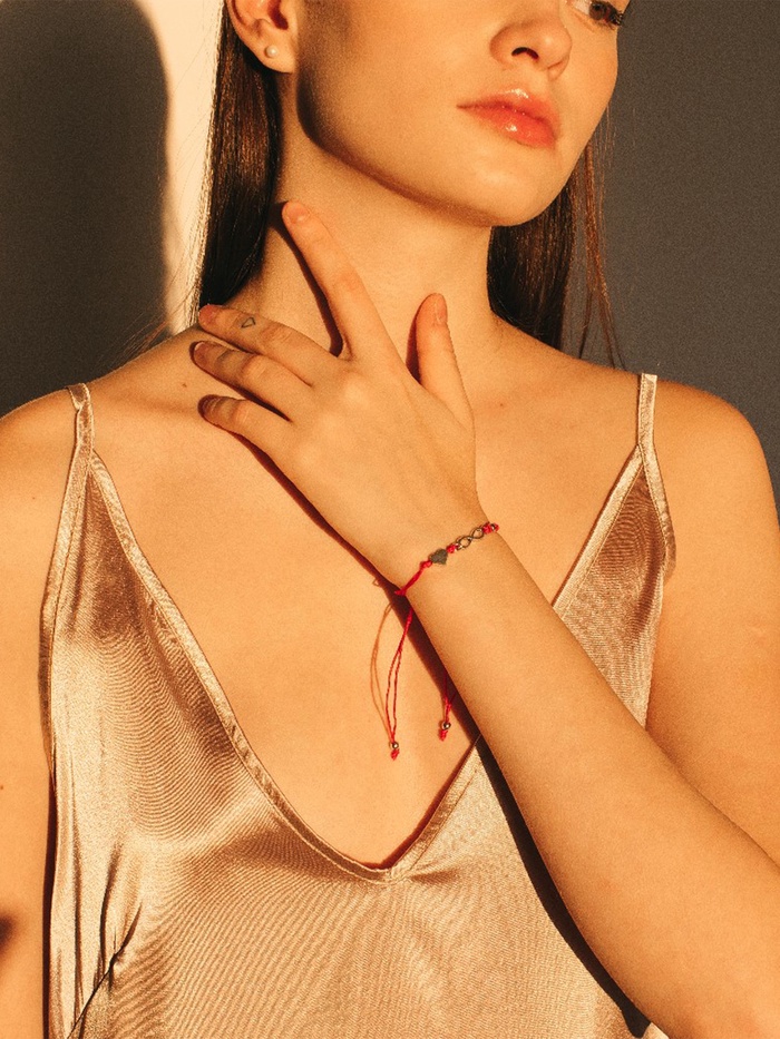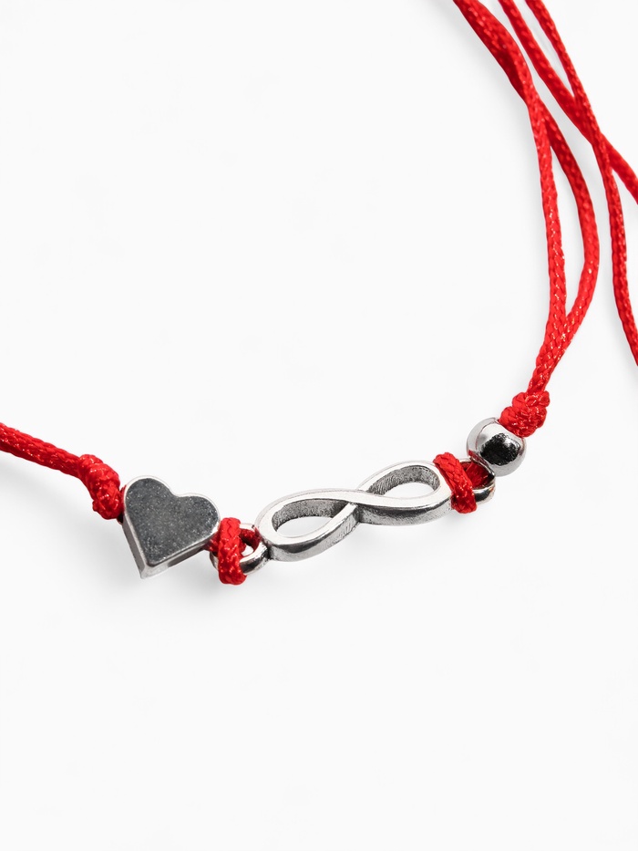 Этот браслет-оберег объединяет символы любви и вечности, воплощённые в изящном сочетании красного текстиля и серебристой металлической подвески. Лёгкая затяжка позволяет легко регулировать размер, обеспечивая комфортное ношение на запястье длиной 8 см. Такой аксессуар станет не только стильным дополнением, но и мощным символом, который поддерживает и укрепляет отношения.