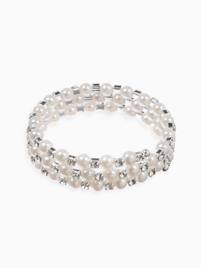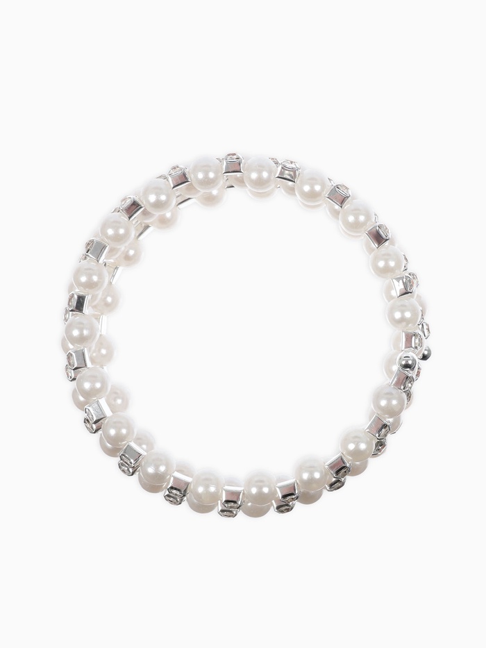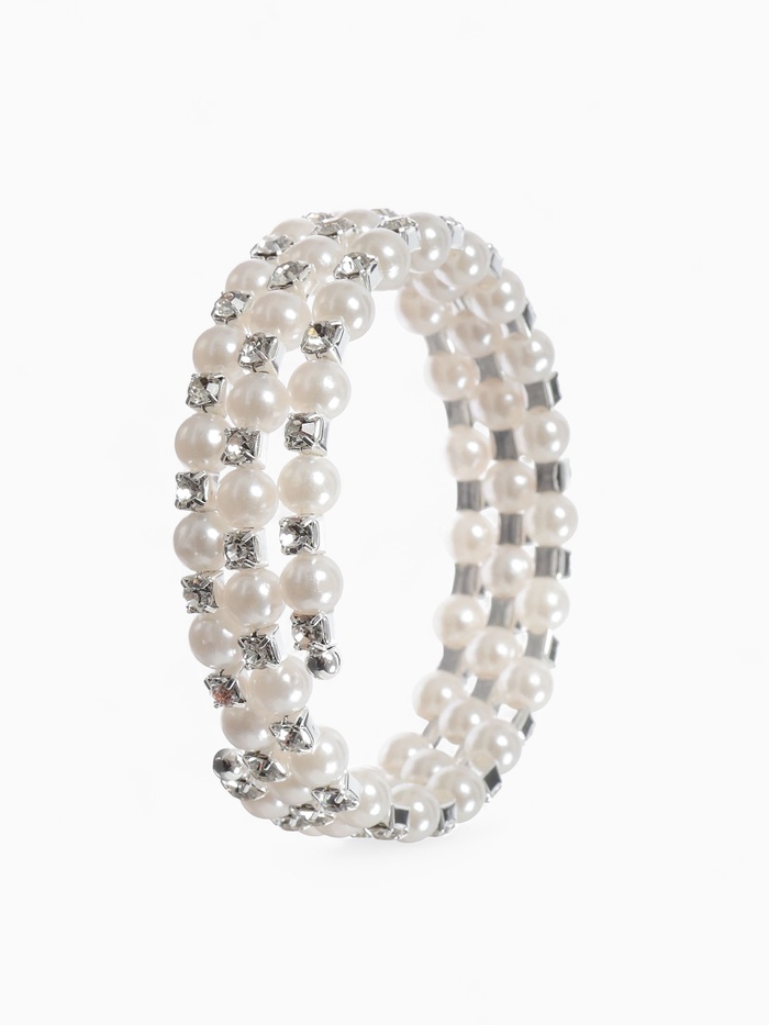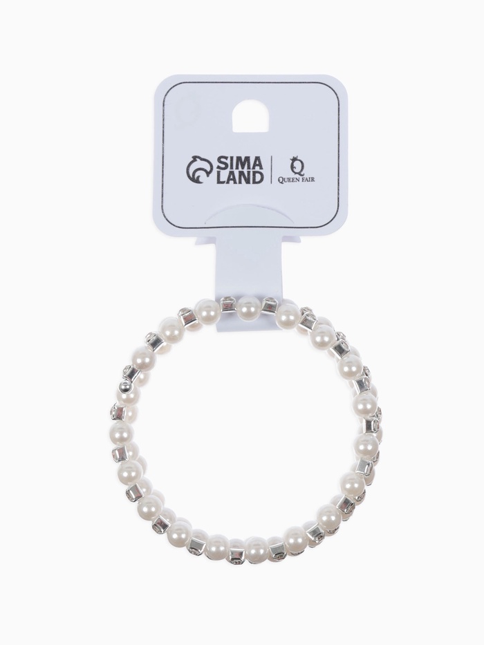 Металлическая основа с серебристым покрытием гармонично сочетается с белыми пластиковыми жемчужинами и аккуратными стразами, создавая утончённый блеск и легкий эффект мерцания. Такой браслет — универсальный выбор как для повседневного ношения, так и для торжественных мероприятий.