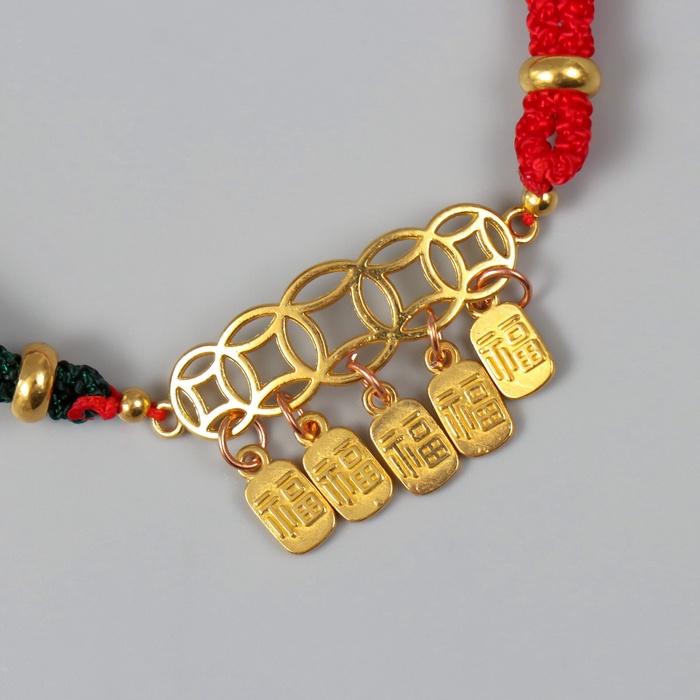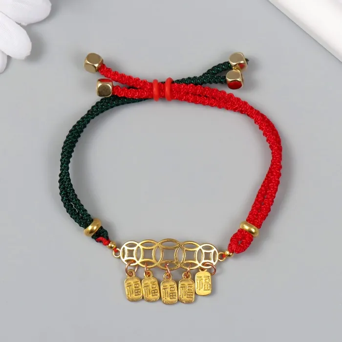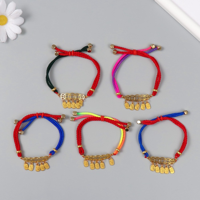 Эти изящные браслеты-талисманы воплощают гармонию древних традиций и современного стиля. Набор из пяти штук с металлическими монетками и изящными иероглифами на текстильной основе создан для тех, кто ценит символику и ищет способ привлечь в свою жизнь удачу и благополучие.