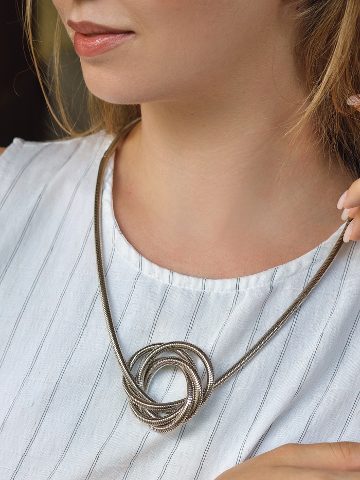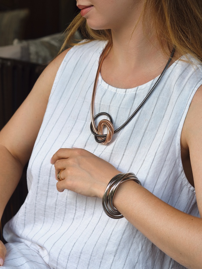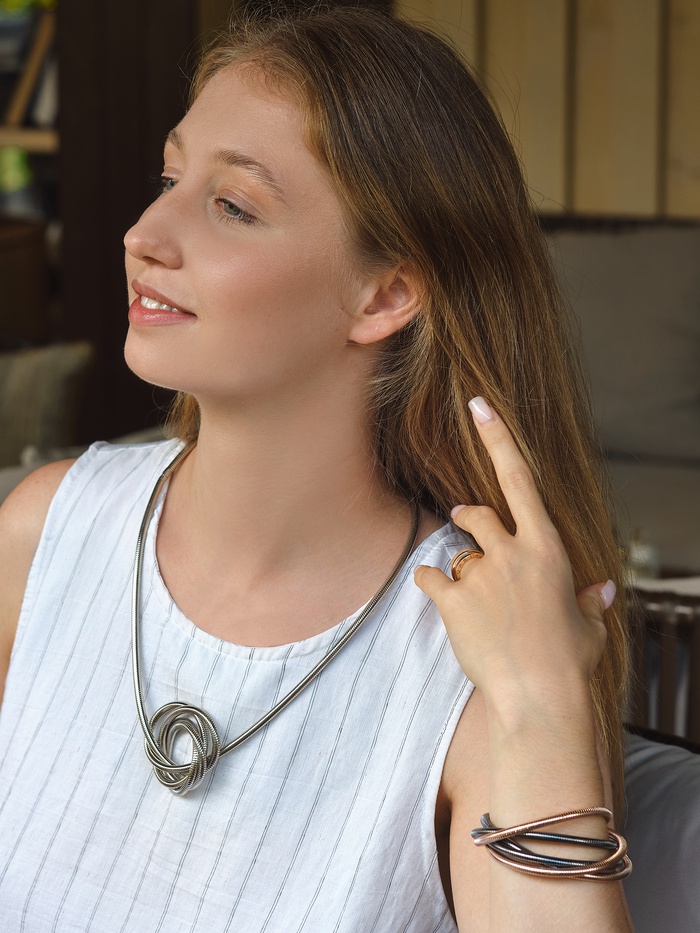 Браслет выполнен в минималистичном стиле, что делает его универсальным дополнением к любому наряду. Отсутствие застёжки обеспечивает максимальный комфорт при ношении, а возможность трансформации в кулон добавляет уникальности и позволяет легко менять стиль в зависимости от настроения или случая.