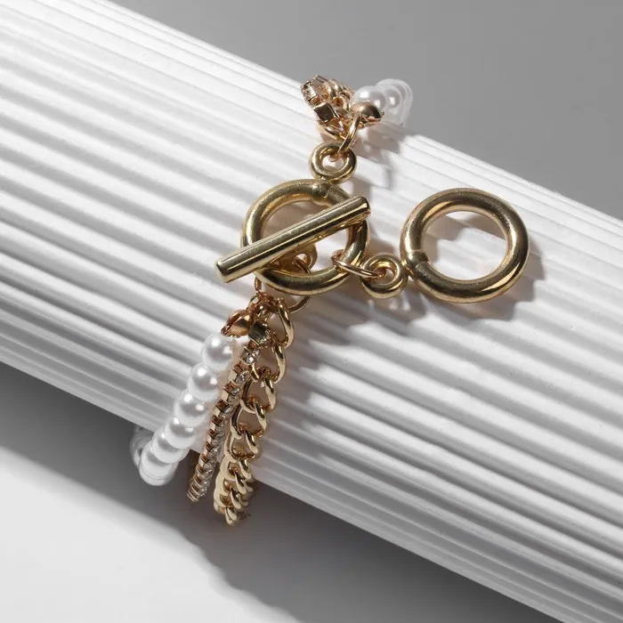 Браслет «Цепь» с тоглом, жемчуг шар №4, белый в золоте, L=16 см