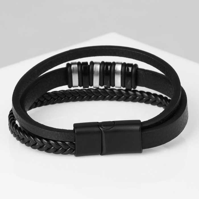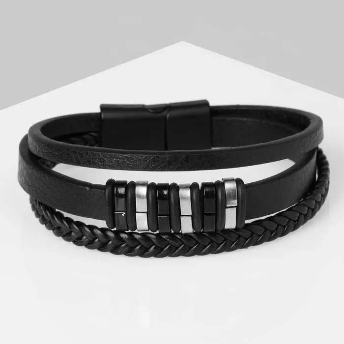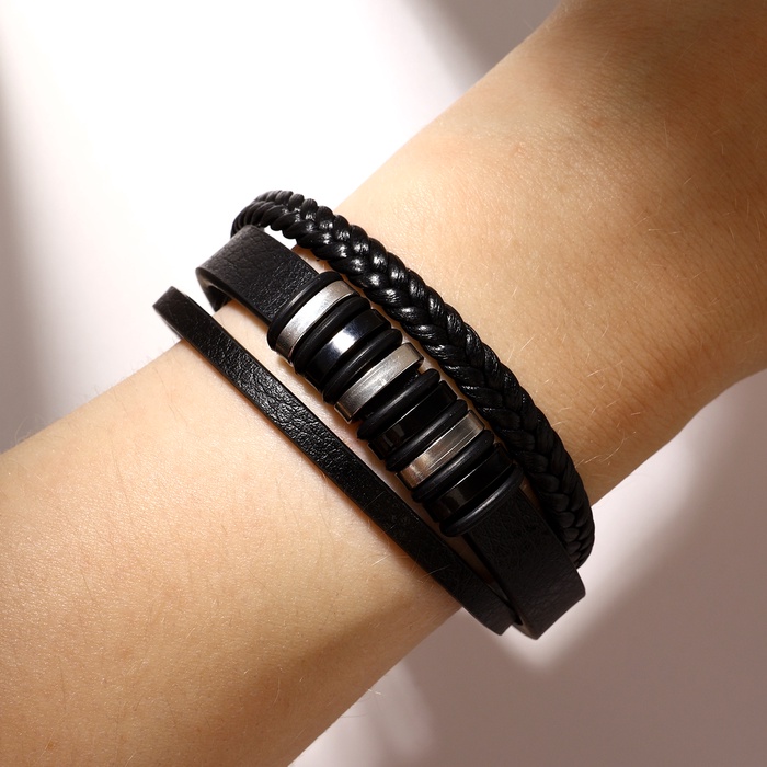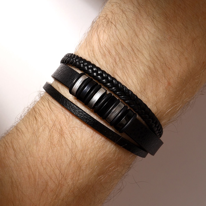 Изготовленный из искусственной кожи и каучука, этот браслет отличается высокой прочностью и долговечностью. Три звена символизируют баланс и силу, а складная застёжка позволяет легко регулировать размер под индивидуальные особенности запястья. Вставка из металла добавляет изделию изящества и современного шика, делая его универсальным аксессуаром для мужчин и женщин.