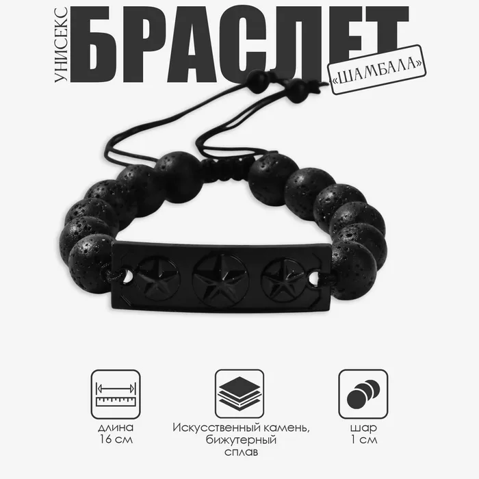 Браслет унисекс «Шамбала» звезды, цвет чёрный с чёрным металлом, шар №10, 16 см — Характеристики