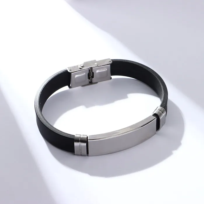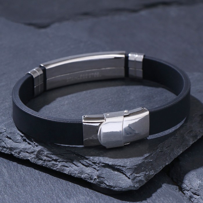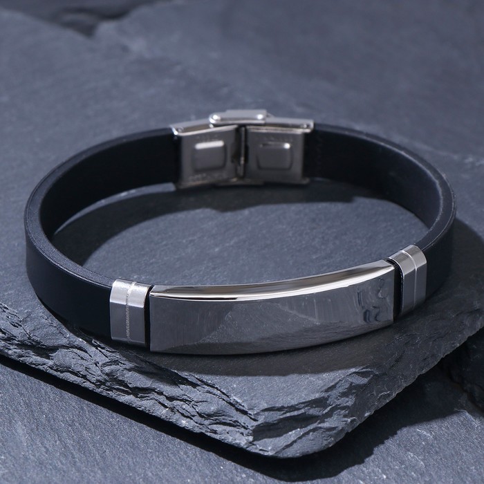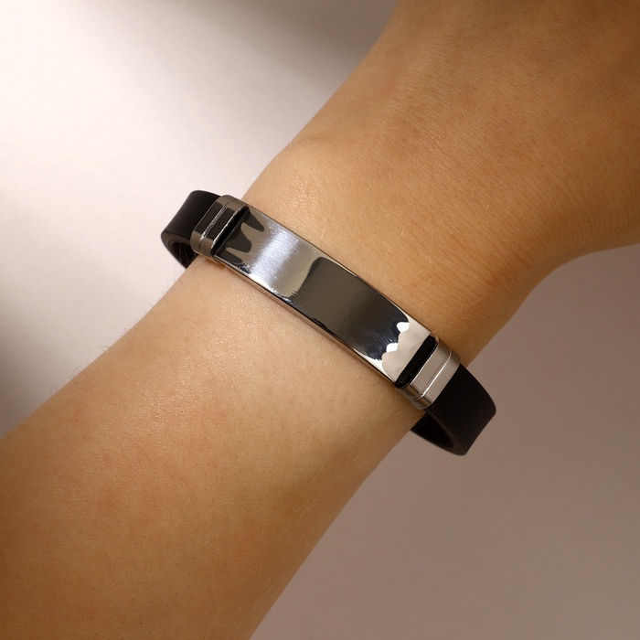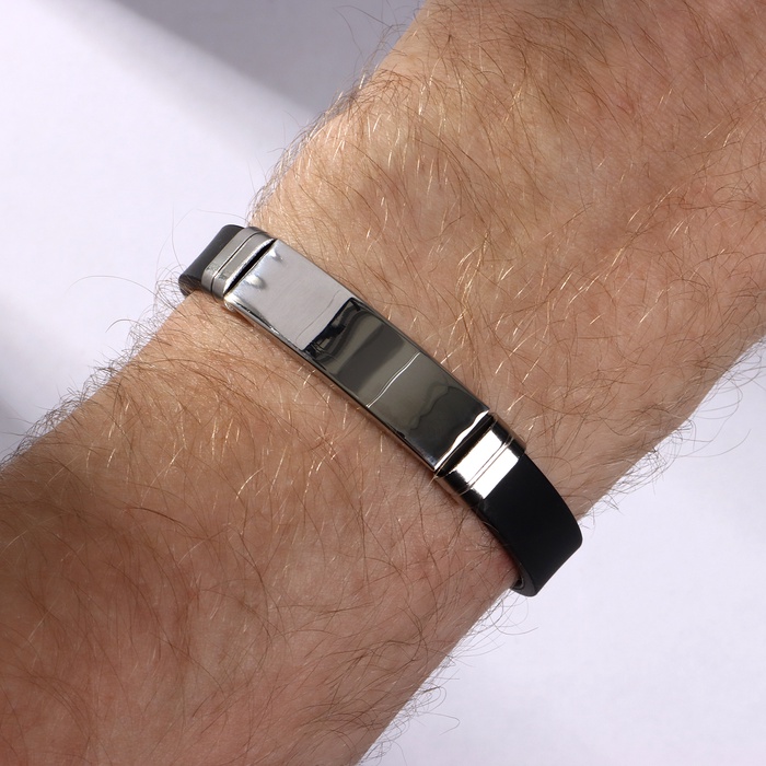 Длина 20,5 см идеально подходит для комфортной носки на запястье, а складная застёжка обеспечивает надежную фиксацию и легкость в использовании. Основой изделия служит прочный каучук, а вставки из металла с серебряным покрытием добавляют изделию изысканности и долговечности.
