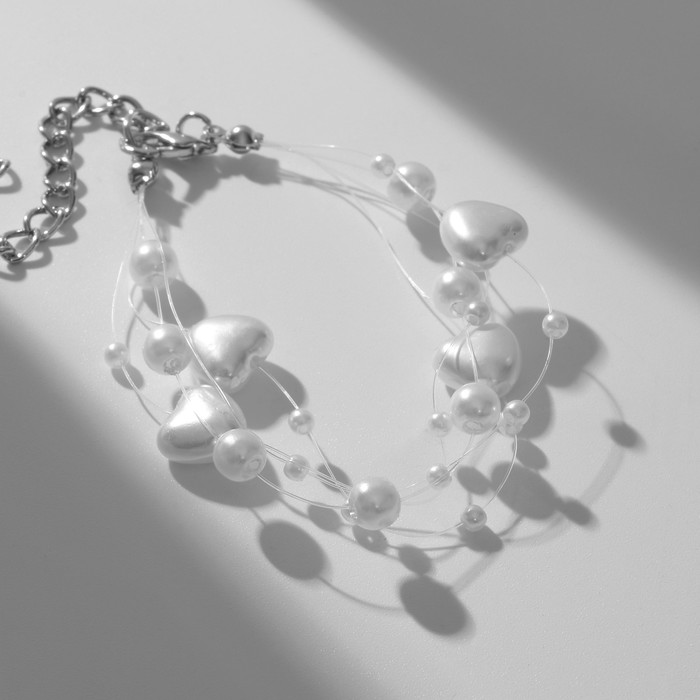 Браслет жемчуг «На леске» сердце, бусины №4, 6, цвет белый в серебре, 16 см