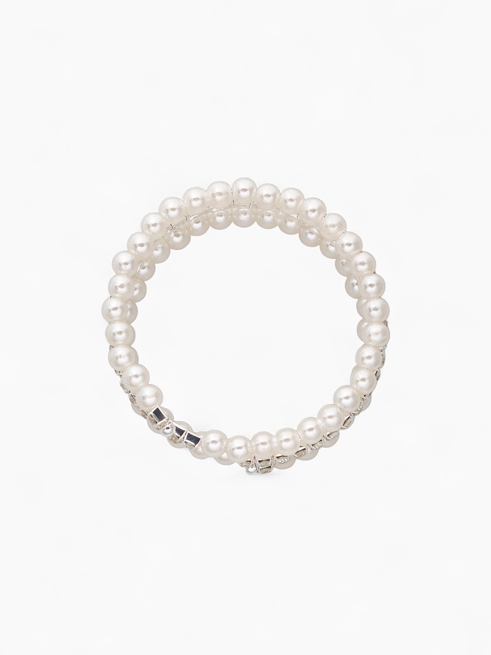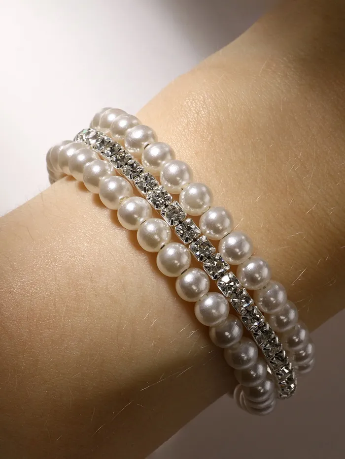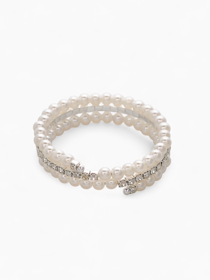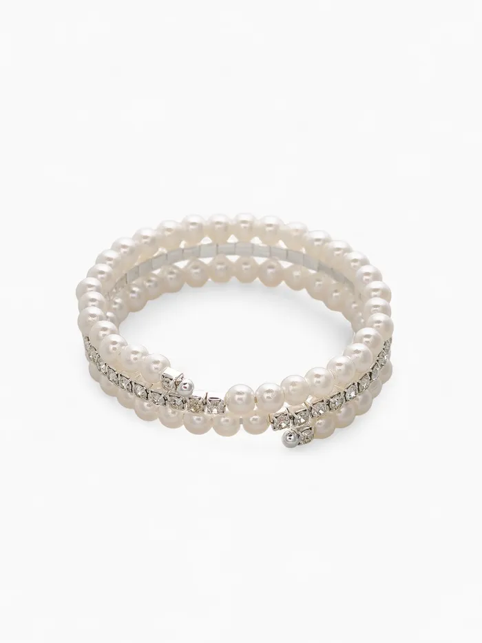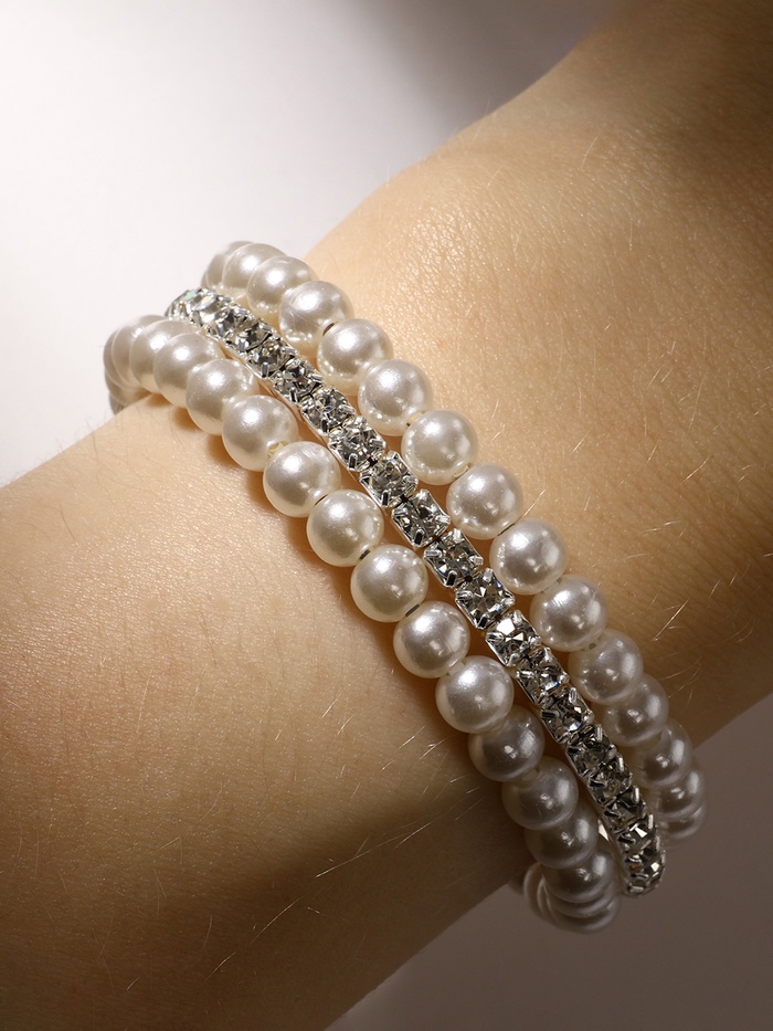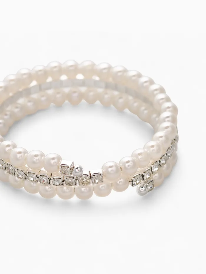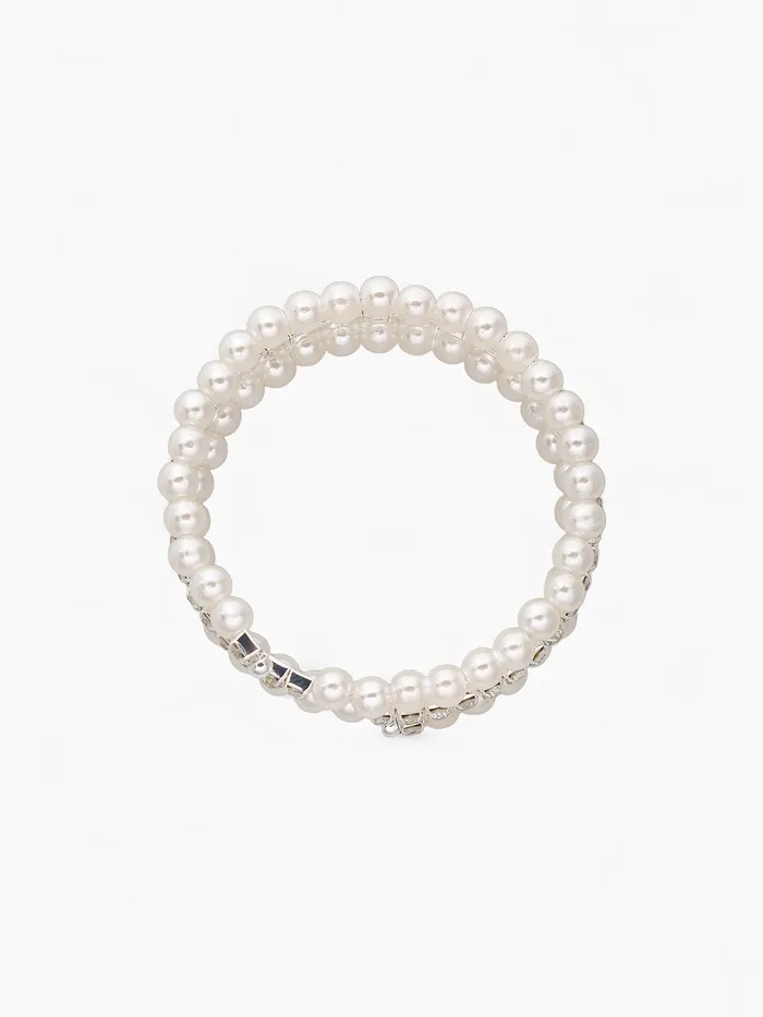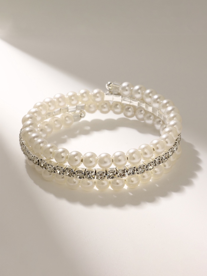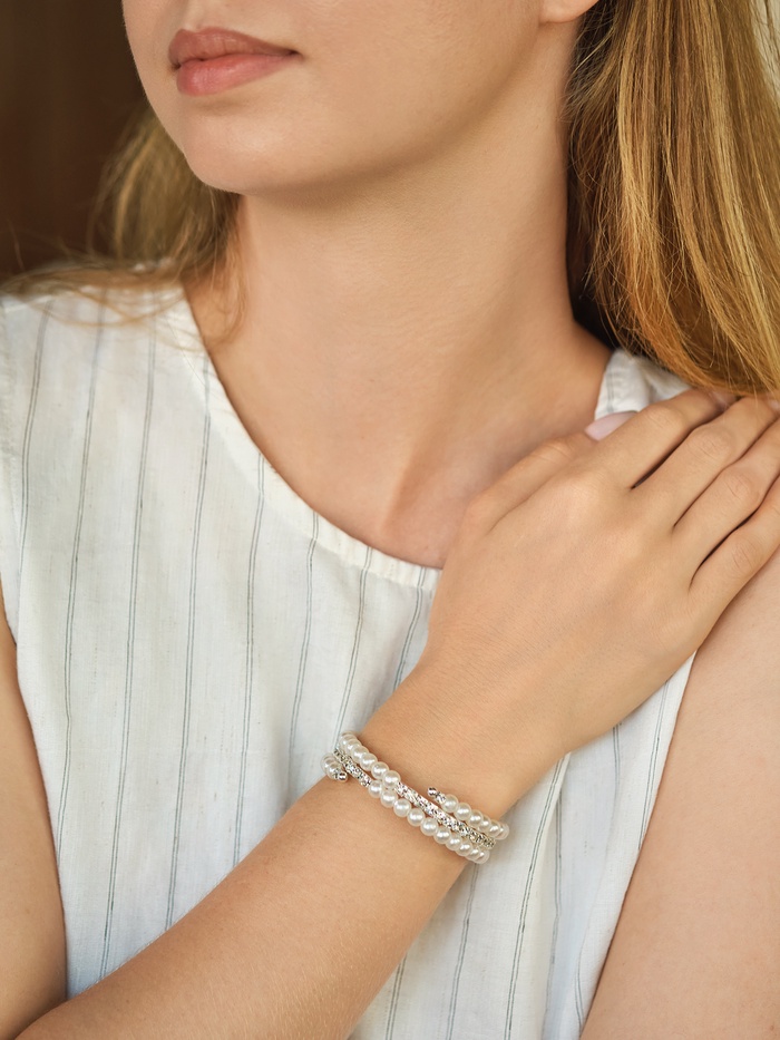 Лёгкий акцент, способный преобразить повседневный образ или дополнить праздничный наряд — именно так можно описать этот браслет с жемчужными бусинами и сияющими стразами. Его пружинная конструкция диаметром 6 см обеспечивает комфортную посадку без застёжек, а белоснежные бусины диаметром 6 мм в обрамлении серебристой фурнитуры создают ощущение утончённости и свежести.