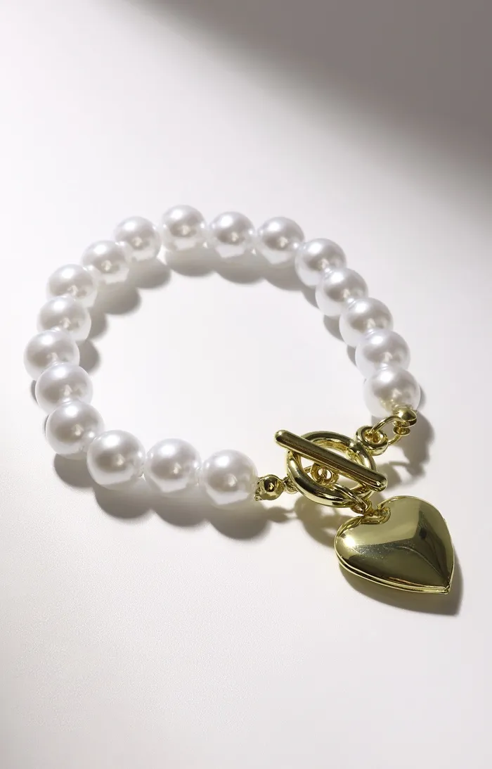 Браслет жемчуг «Сердечко» для фото, шар №10, белый в золоте, L=21 см