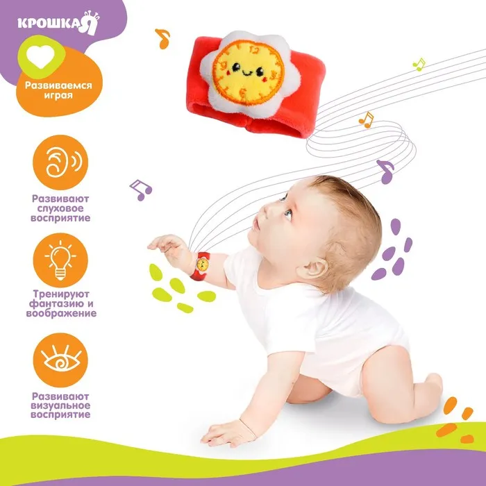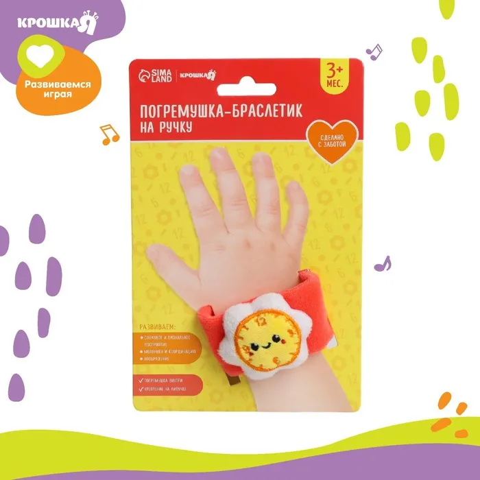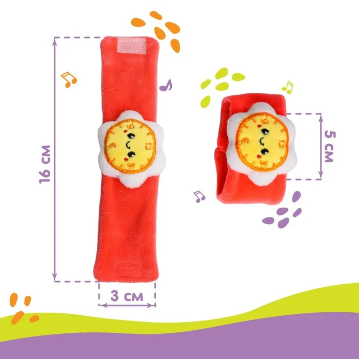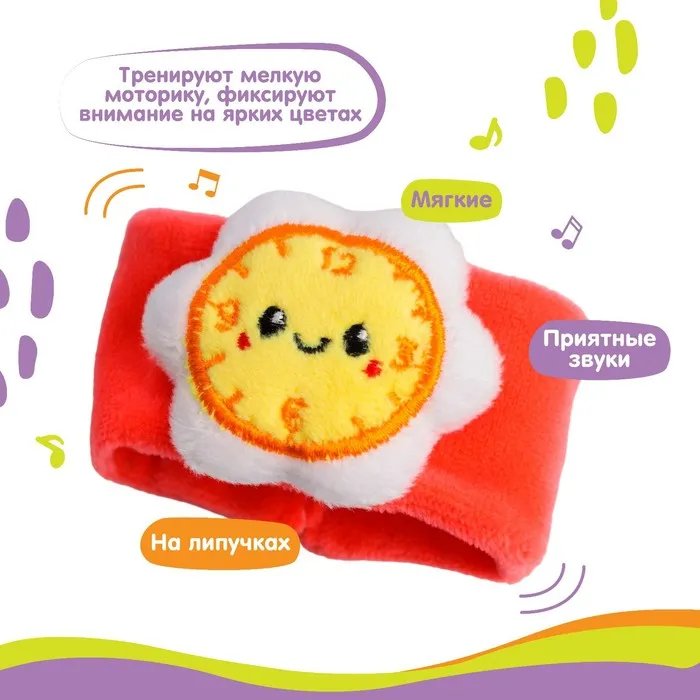 Развивающая игрушка выполнена в виде браслетика на липучке. В комплект входят две штуки. Их можно надеть малышу на ручки или ножки. Звуковые элементы будут греметь, когда непоседа сменит положение тела.