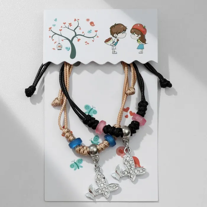 Браслеты парные «Неразлучники» две бабочки с бусинами, чёрно-бежевые, d=8 см — Характеристики