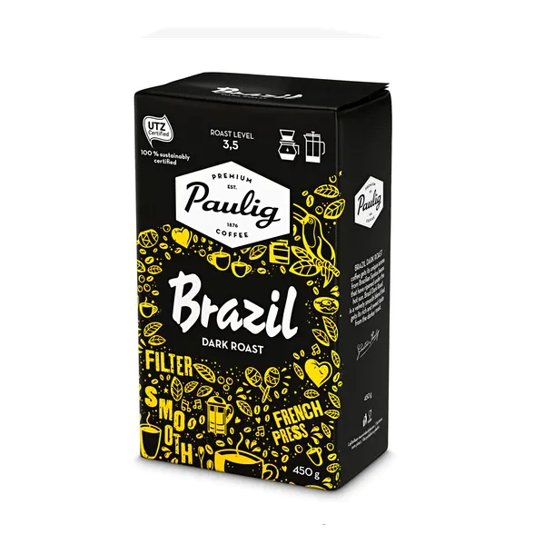 Бразильский кофе темной обжарки - это смесь кофе арабика с бархатисто-мягкой обжаркой, темная обжарка которой придает кофе богатый и жареный сладкий вкус. Особенно понравится любителям темного кофе, которые хотят наслаждаться мягким и сладким кофе. Уникальный аромат кофе Brazilian Dark Roast исходит от бразильских зерен Santos, созревших в жаркие солнечные дни. Степень обжарки 3.5.