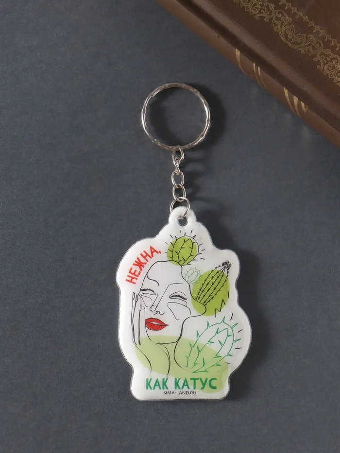 - Брелок с надписью «Нежна, как кактус» сочетает в себе юмор и практичность. Надпись привлекает внимание и дарит позитивные эмоции.