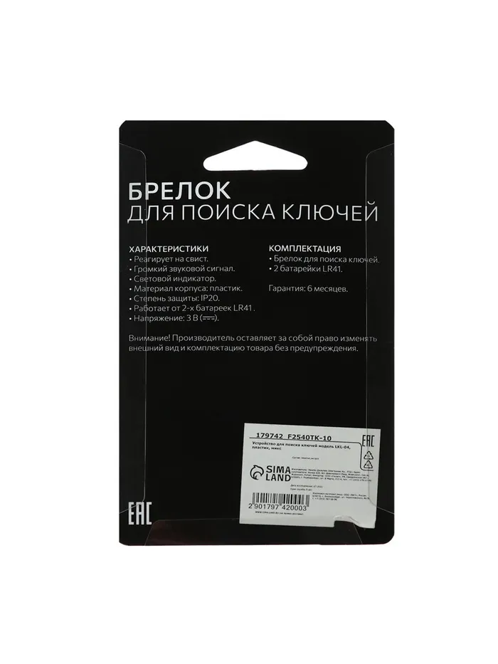 Брелок выполнен из пластика, что делает его легким и прочным. Он реагирует на свист, издавая громкий звуковой сигнал, который поможет вам быстро обнаружить потерянные ключи. Световая индикация дополнительно облегчает поиск в темное время суток. Компактные размеры и легкость позволяют носить брелок всегда с собой, не испытывая дискомфорта. Для работы устройства требуется всего две батарейки типа LR41, что обеспечивает длительное время использования без необходимости частой замены.