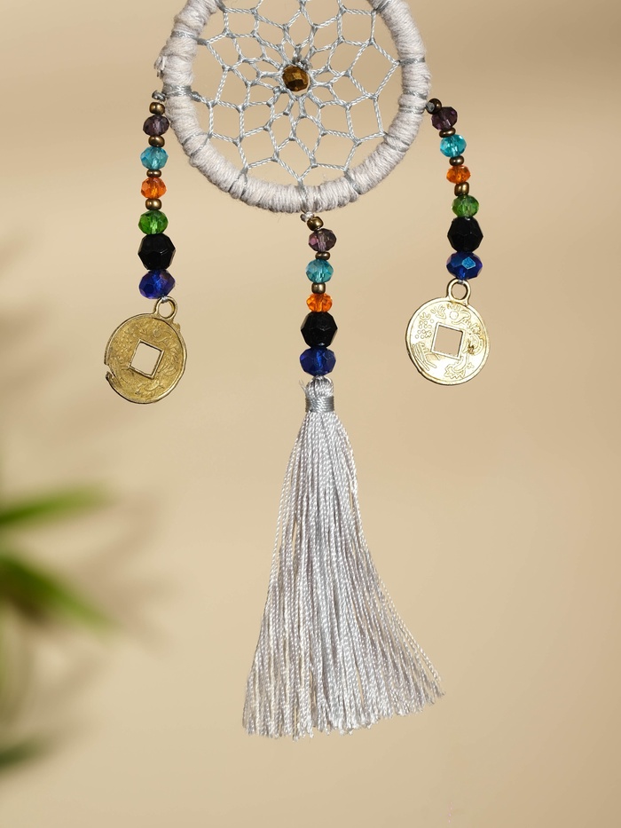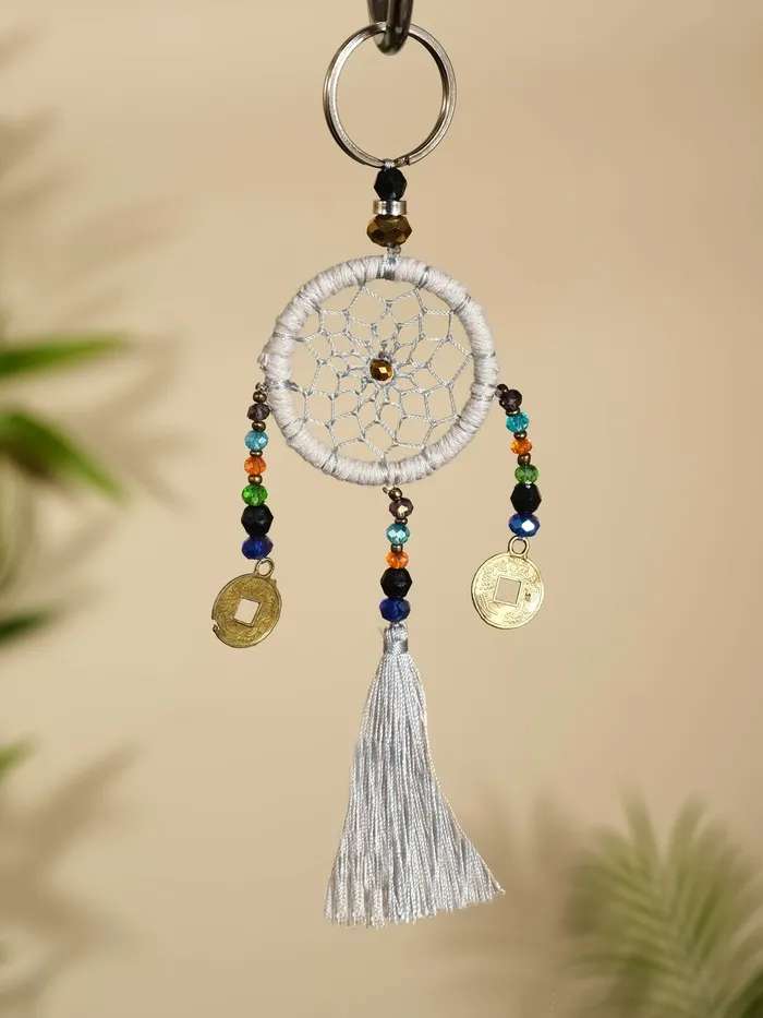 Этот аксессуар не только украшает, но и несёт в себе глубокий смысл. Ловец снов традиционно считается оберегом, который защищает от плохих снов и негативной энергии. Брелок в таком стиле станет приятным напоминанием о заботе и внимании, а его нейтральный бежевый цвет подойдёт для тех, кто ценит сдержанность и элегантность.