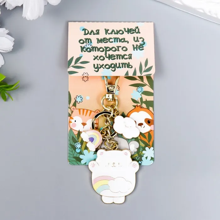 Брелок металл, эмаль с карабином "Белый мишка с облаком и радугой"