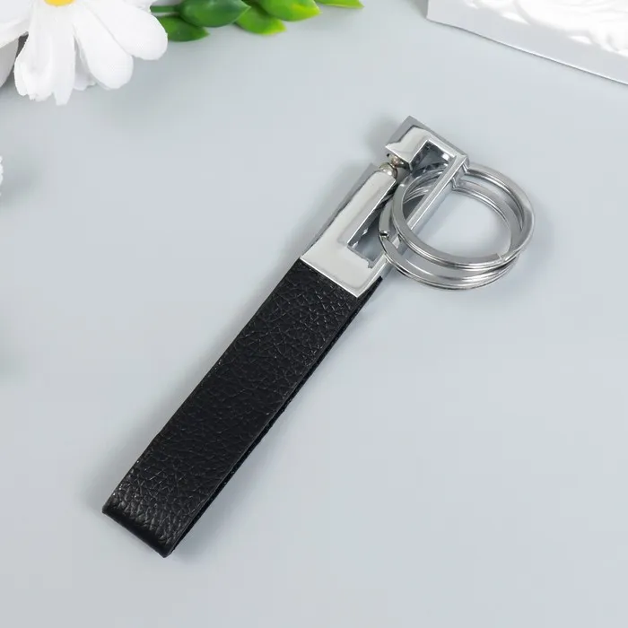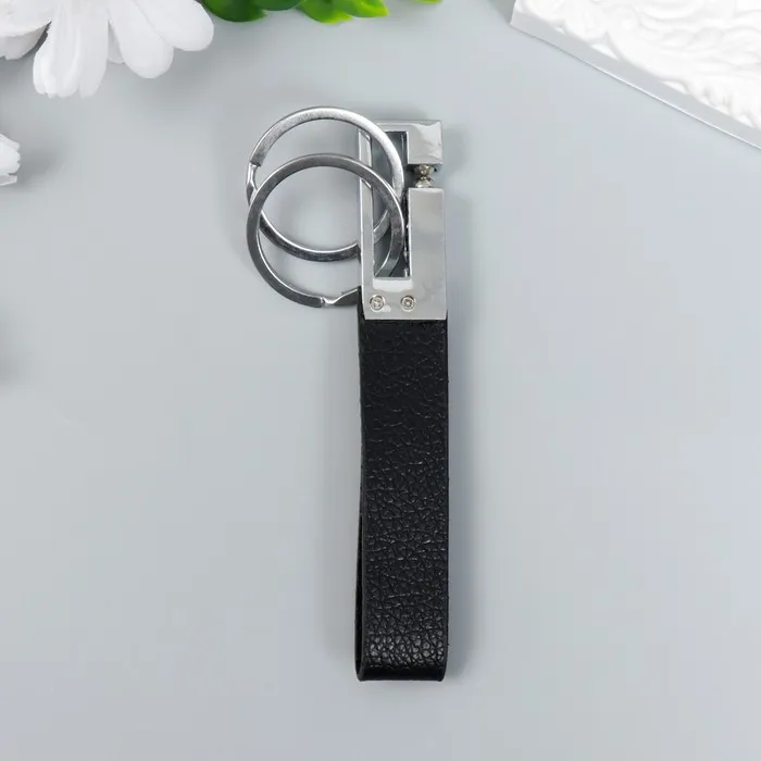 Брелок металл "Карабин стильный с ремешком и 2-мя кольцами" черный, серебро