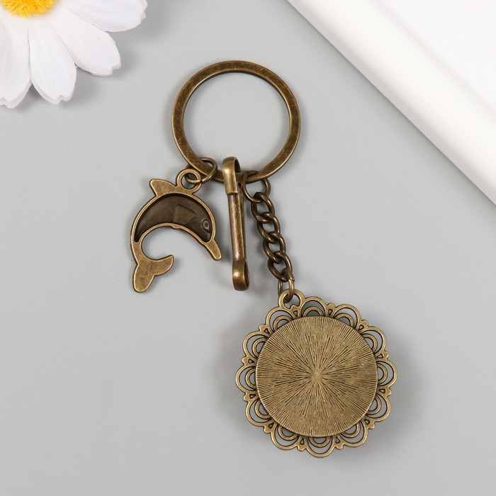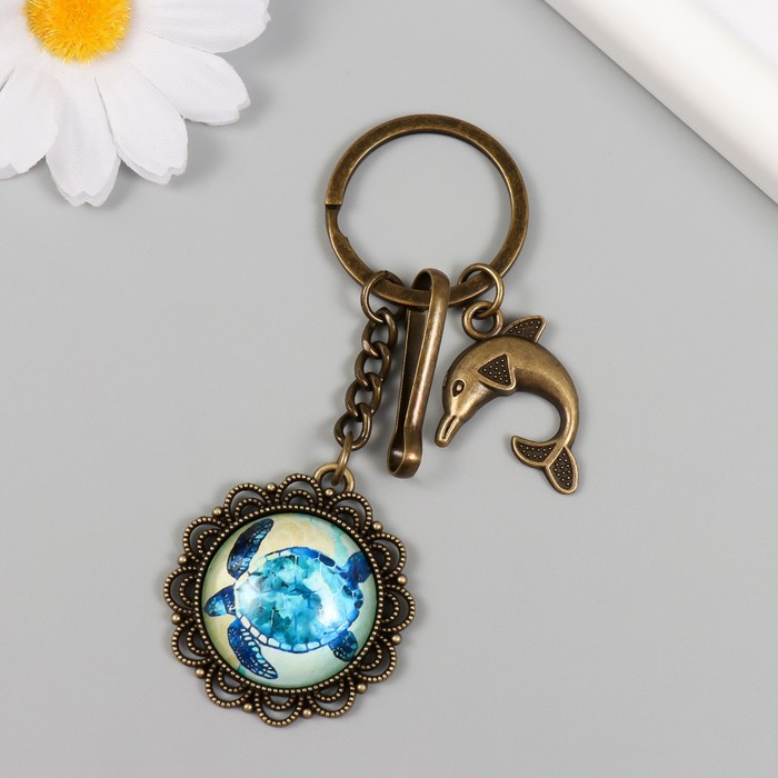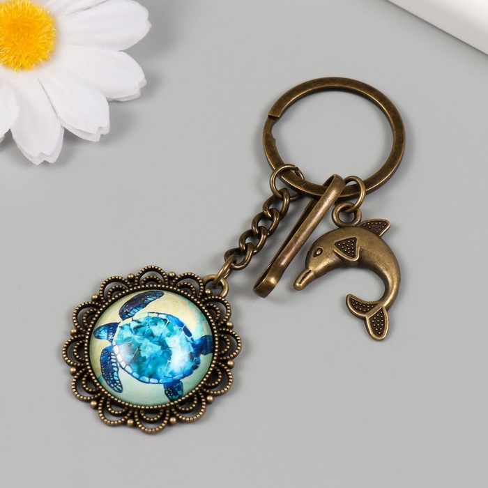 Брелок металл, стекло с карабином "Дельфин и черепашка в медальоне" бронза 9,5 см
