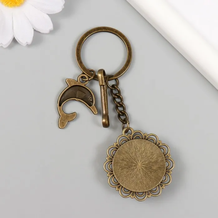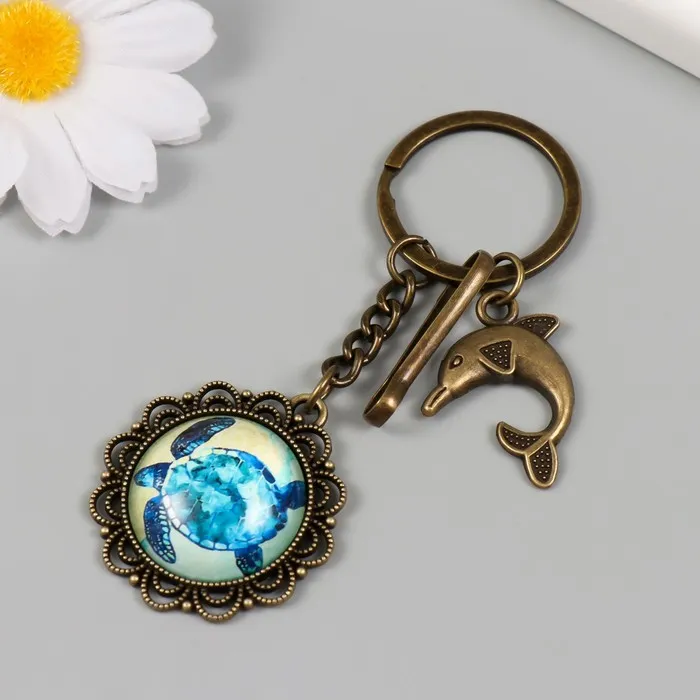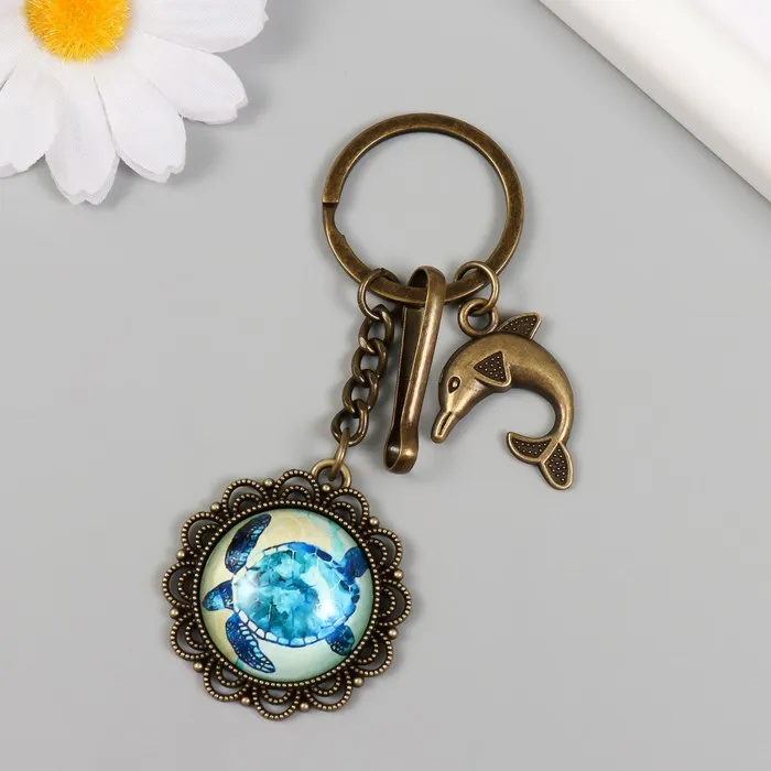 Брелок металл, стекло с карабином "Дельфин и черепашка в медальоне" бронза 9,5 см — Характеристики