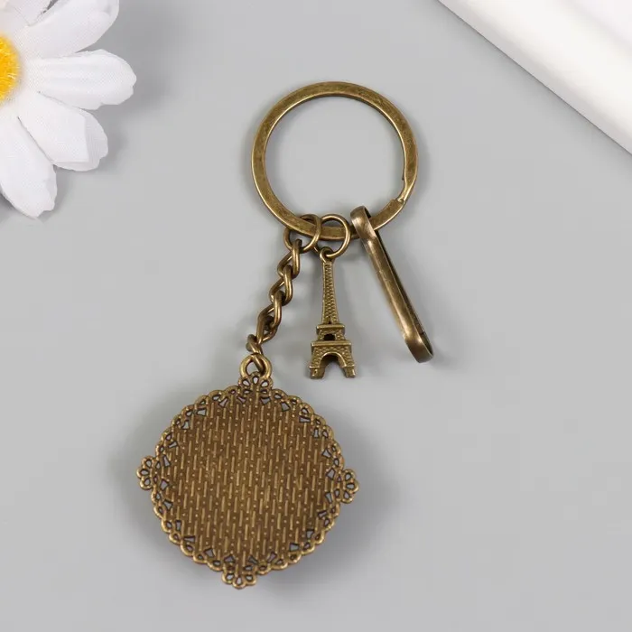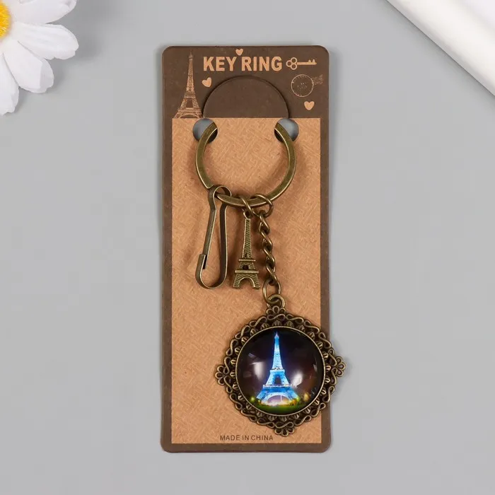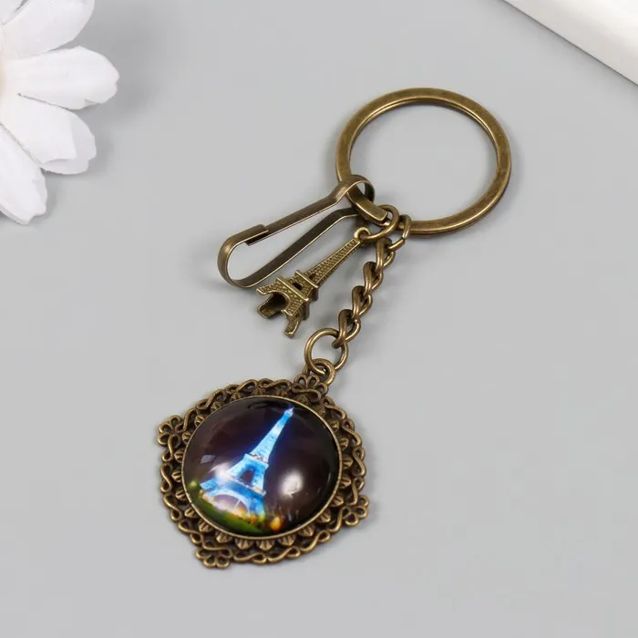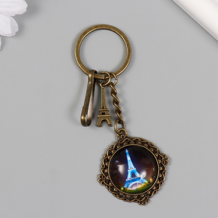 Брелок металл, стекло с карабином "Эйфелева башня и медальон" бронза 9,5 см