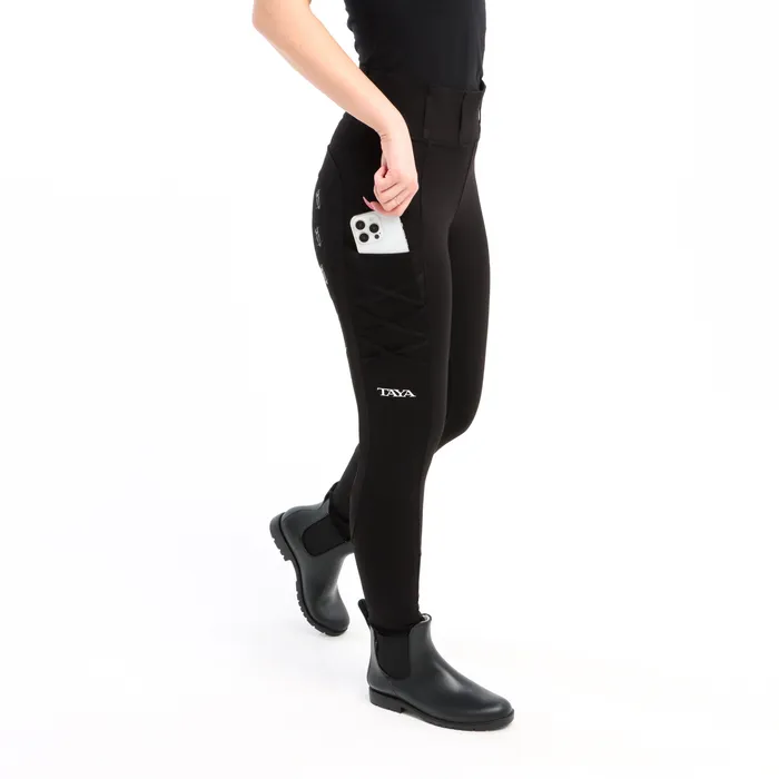 Спортивные бриджи для верховой езды «Aphrodite» представляют новую коллекцию «Pantheon» бренда TAYA Equestrianism. По ощущениям такие бриджи столь же комфортные, как и обычные женские спортивные лосины, но при этом имеют боковые карманы, а также полную силиконовую лею, которая надежно удержит в седле при любых обстоятельствах. Бордовые бриджи данной линейки имеют крепкие, максимально износостойкие, но вполне мягкие швы, а достаточно высокая талия и плотная посадка на широкой резинке пояса отлично защищает поясницу от продувания при активной езде или при использовании в комплекте с коротким спортивным топом. Данные конные бриджи с карманами, причем удобными, так как в них вмещаются не только мелкие вкусняшки для лошади, но и, к примеру, полностью помещается смартфон без вероятности его выпадения во время конкура или выездки. В них легче и проще переносить летнюю жару и можно считать своим стандартным всесезонным вариантом для не экстремальных температур.