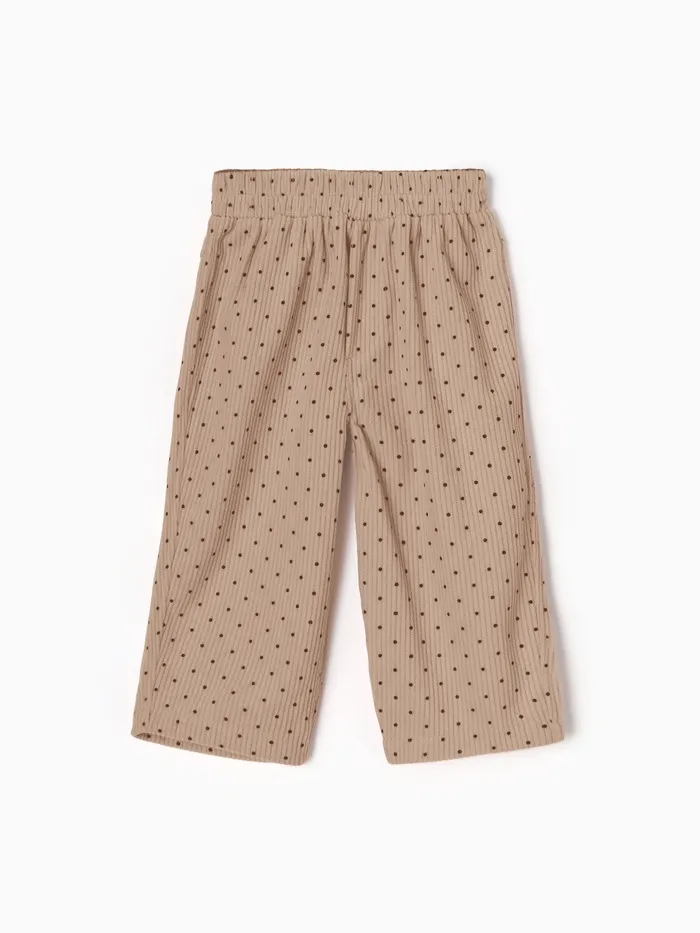 - Стильный дизайн. Нежный бежевый цвет и милый рисунок в горошек делают брюки привлекательными.