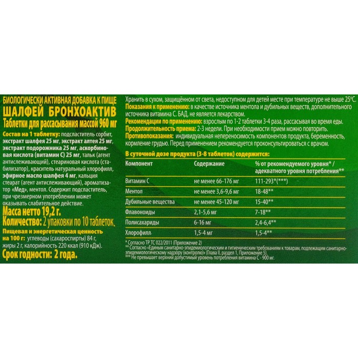 Состав на 1 таблетку подсластитель сорбит, экстракт шалфея 25 мг, экстракт алтея 25 мг, экстракт подорожника 25 мг, аскорбиновая кислота (витамин С) 25 мг, тальк (агент антислеживающий), стеариновая кислота (стабилизатор), краситель натуральный хлорофилл, эфирное масло шалфея 4 мг, кальция стеарат (агент антислеживающий), ароматизатор мед, ментол.