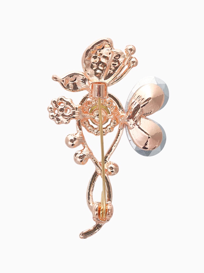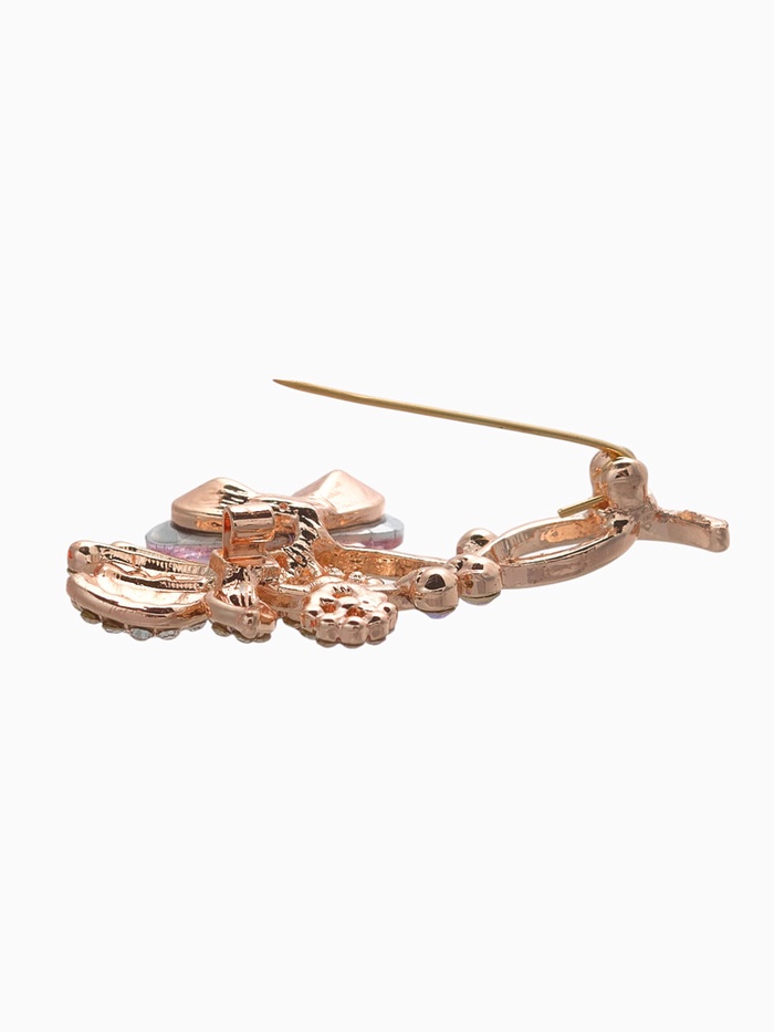Металлическое основание с золотистым покрытием розового оттенка придаёт броши благородство и прочность, а вставки из стекла и сверкающих страз добавляют изысканный блеск и игру света. Гармоничное сочетание розового и белого цветов усиливает визуальное восприятие и подчёркивает женственность изделия.