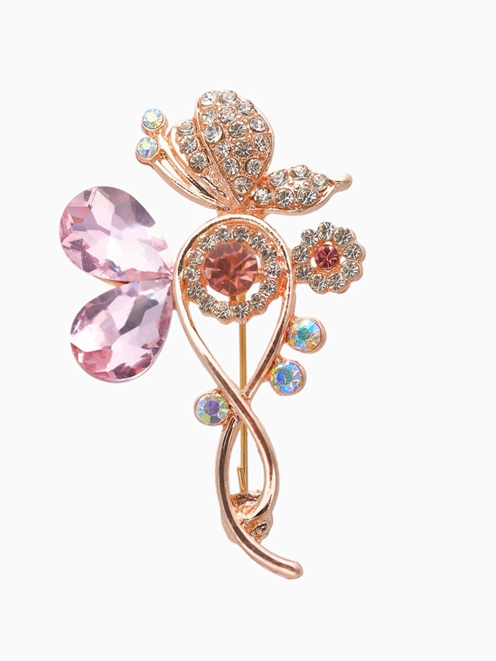 Металлическое основание с золотистым покрытием розового оттенка придаёт броши благородство и прочность, а вставки из стекла и сверкающих страз добавляют изысканный блеск и игру света. Гармоничное сочетание розового и белого цветов усиливает визуальное восприятие и подчёркивает женственность изделия.