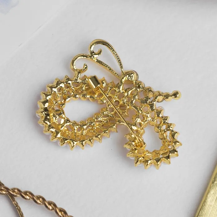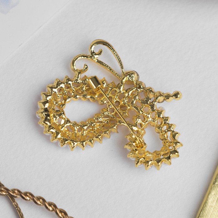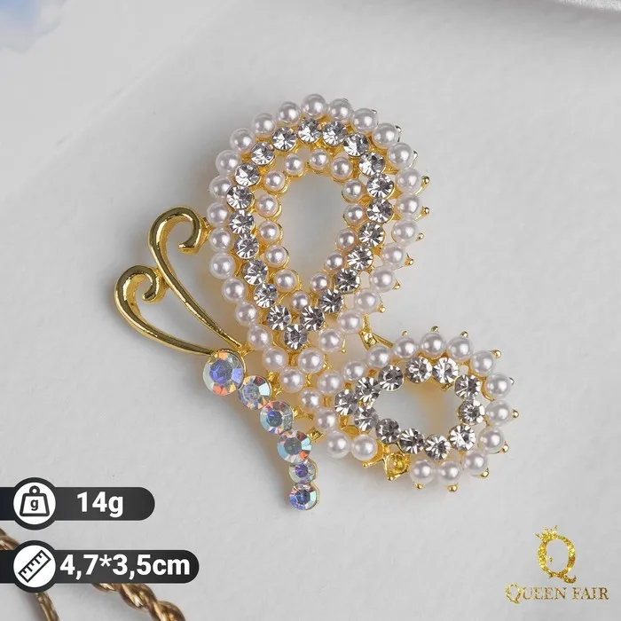 Изящная брошь в форме бабочки с искусственным белым жемчугом и сверкающими стразами воплощает лёгкость и утончённость, добавляя образу женственности и изящества. Золотистый металлический каркас подчёркивает благородство и тепло украшения, делая его универсальным аксессуаром для любого случая.