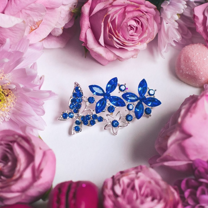 Эта изящная брошь с бабочками синеглазками воплощает лёгкость и изящество природы в элегантном серебристом исполнении с насыщенным синим оттенком. Компактная длина 5,5 см и утончённый дизайн с использованием полистоуна и сверкающих страз создают эффект живого движения, который привлечёт взгляды и подчеркнёт вашу индивидуальность.