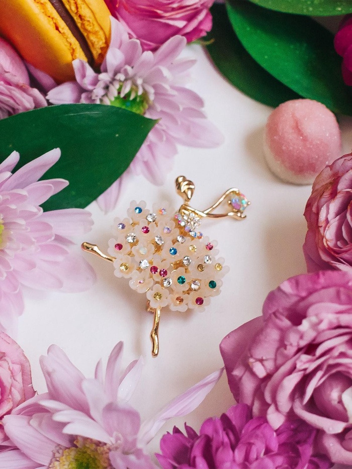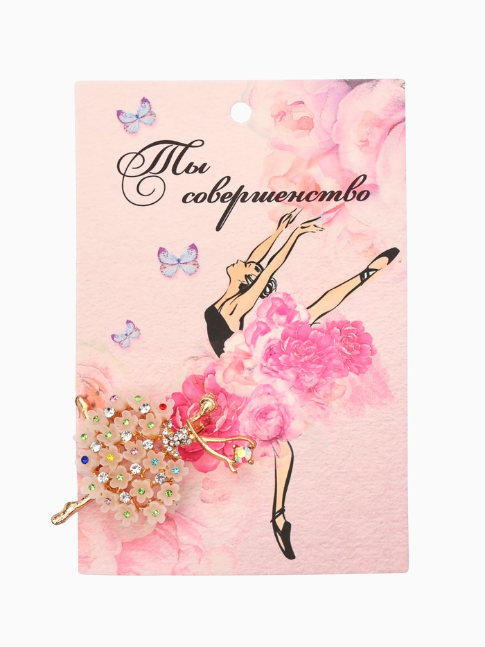 Эта изящная брошь с образцом балерины воплощает женственность и грацию, добавляя яркие цветовые акценты в любой образ. Золотистая фурнитура гармонично сочетается с многоцветными вставками из страз и пластика, создавая эффект живой, динамичной композиции.