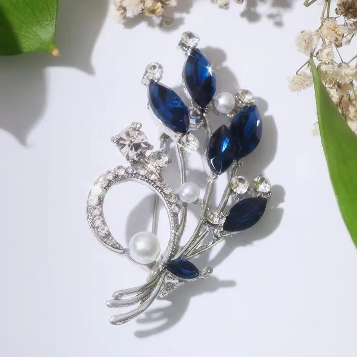 Изысканная брошь в форме букета цветов сочетает в себе нежность белых и глубокую свежесть синих оттенков, воплощая гармонию природы и утончённый стиль. Серебристый металлический каркас придаёт изделию лёгкость и прочность, а тонкая работа с вставками из жемчуга, стекла, страз и пластика создаёт эффект живого цветочного ансамбля.