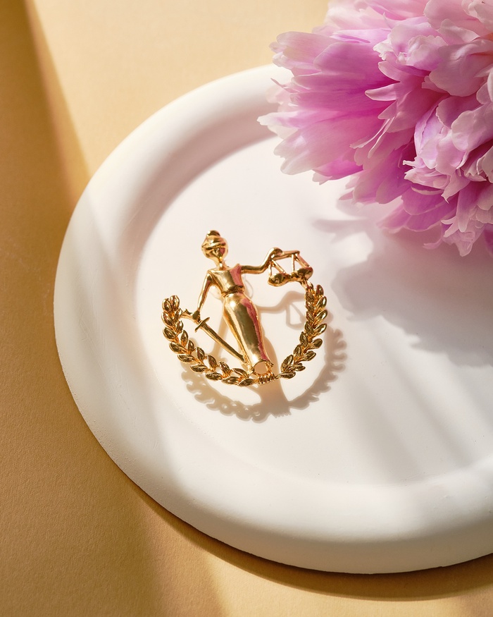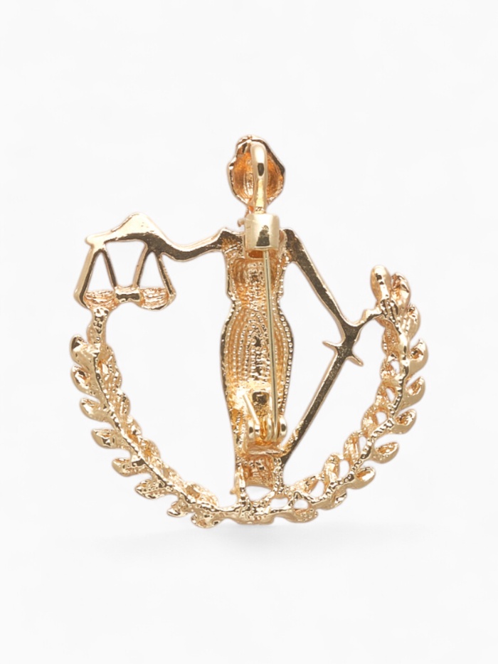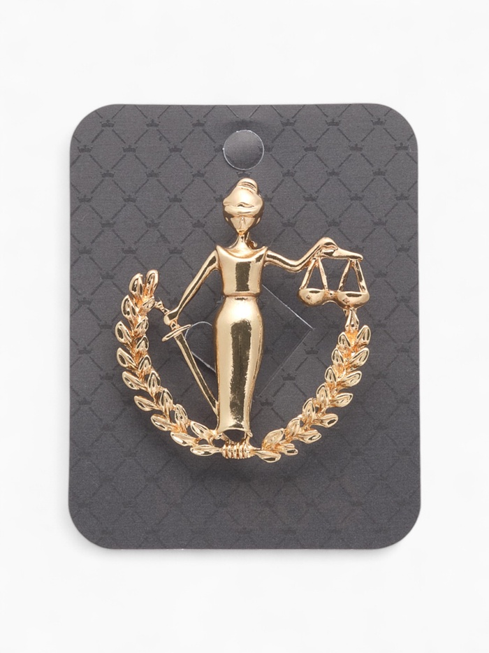 Погрузитесь в атмосферу справедливости и элегантности с изысканной брошью в образе богини правосудия — Фемиды. Этот уникальный аксессуар, выполненный в золотистом цвете, станет не только стильным дополнением к вашему образу, но и символом мудрости и честности.