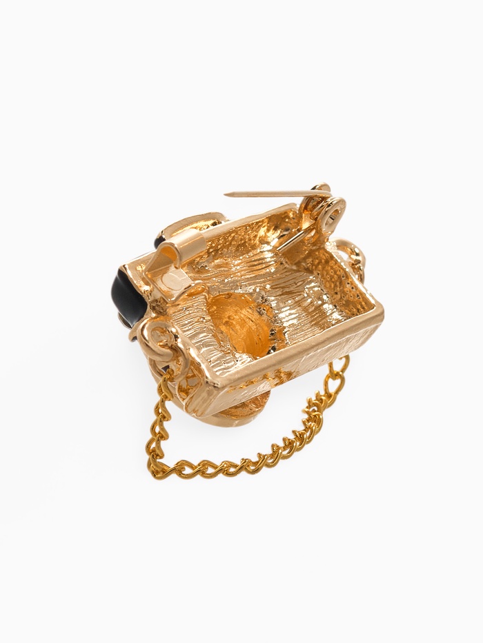 Хотя брошь небольшого размера (всего 3 см), она выглядит внушительно и элегантно, будучи выполненной из высококачественного металла с золотой отделкой и пластиком, что обеспечивает четкость рисунка и глубину черного цвета. Фасонные элементы моделируют изображение старого пленочного фотоаппарата, вызывая ассоциации с ретро-стилем и винтажными снимками прошлого века.