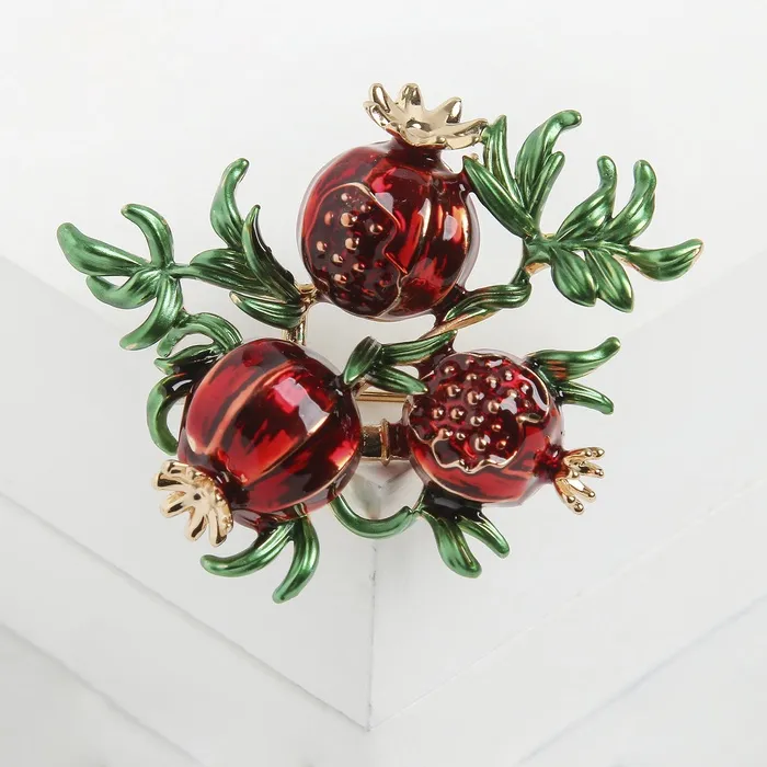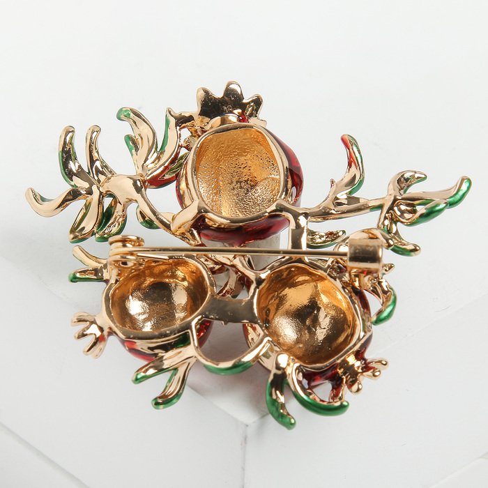 Изящная брошь в форме граната с красно-зелёными эмалевыми вставками и золотистым металлическим основанием станет ярким акцентом в вашем образе. Компактный размер в 4 см позволяет носить украшение как на повседневной одежде, так и дополнять праздничный наряд, придавая ему особую изысканность и глубину цвета.