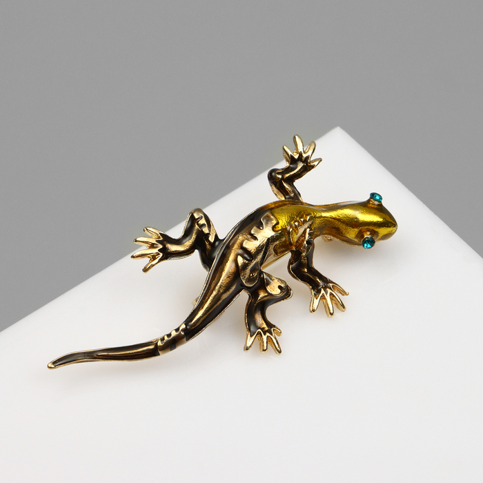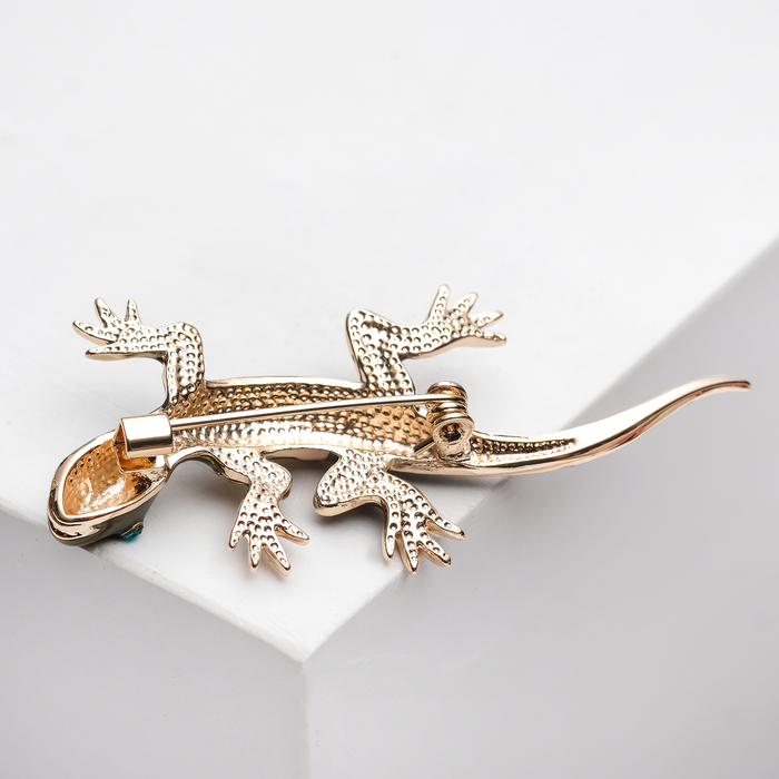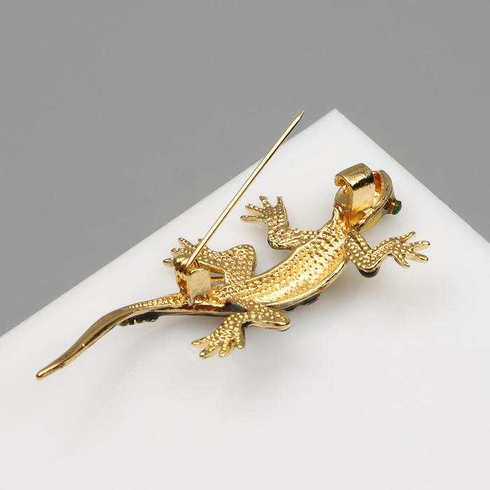 Нестандартный акцент в украшении. Изящная брошь с изображением ящерицы в тёмно-зелёных тонах на золотом фоне станет заметным дополнением женского образа.
