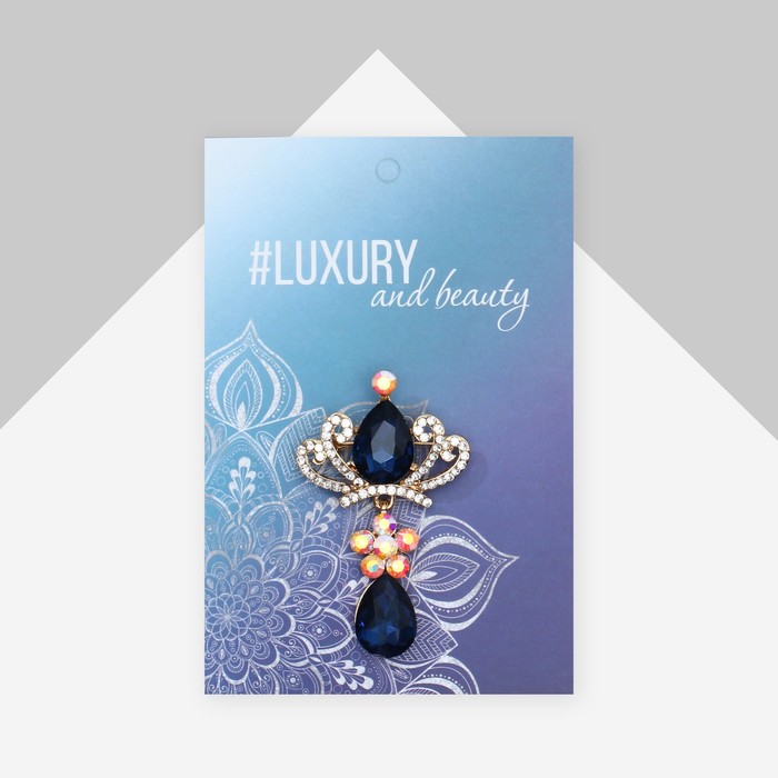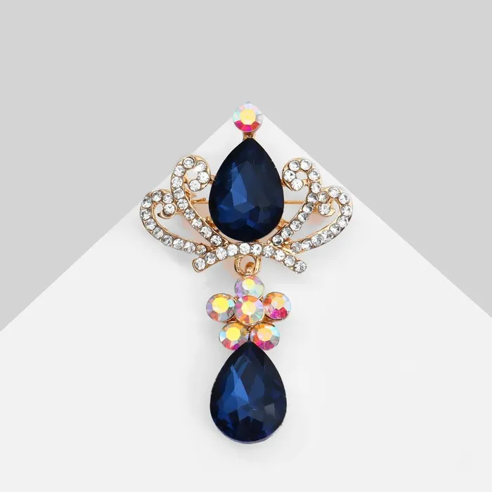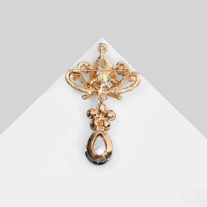 Изготовленная из качественного металла с декоративными вставками из стекла и сверкающих страз, брошь отличается прочностью и долговечностью. Золотистый оттенок фурнитуры придаёт изделию благородство, а подвеска добавляет динамичности и лёгкости в общий образ.