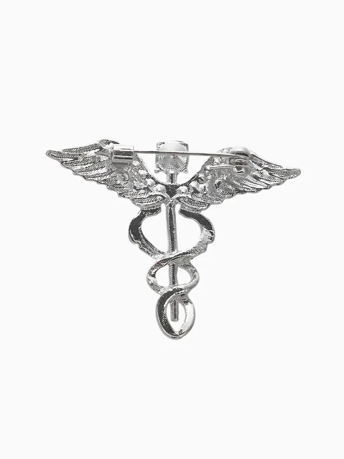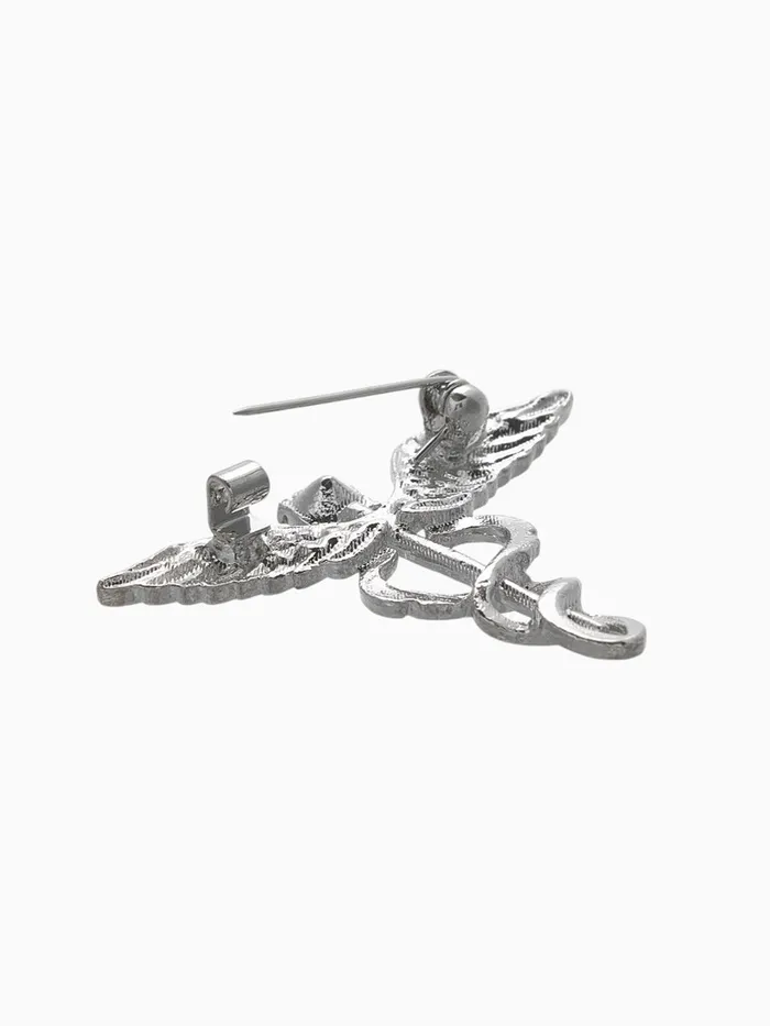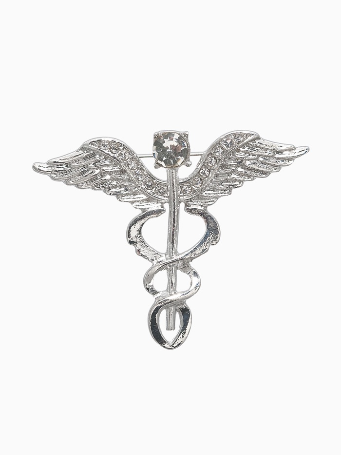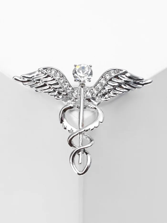 Изящная брошь с изображением кадуцея в серебристом исполнении — символ профессионализма и преданности медицинскому делу. Её лаконичный дизайн подчёркивает значимость профессии, а белый цвет с блестящими стразами придаёт украшению благородство и элегантность.
