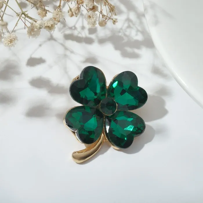 Металлическая основа украшена блестящими стразами и стеклянными вставками, которые создают эффект глубины и переливов, словно настоящий листок клевера, наполненный живой энергией. Такой аксессуар станет символом удачи и процветания, а также гармонично подчеркнёт индивидуальность каждой женщины.