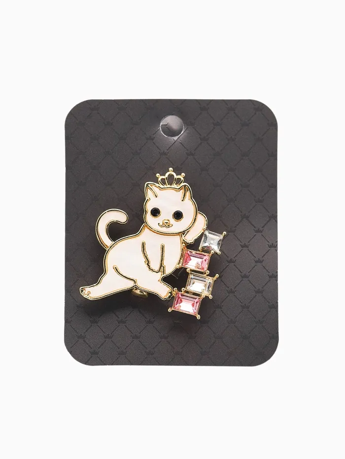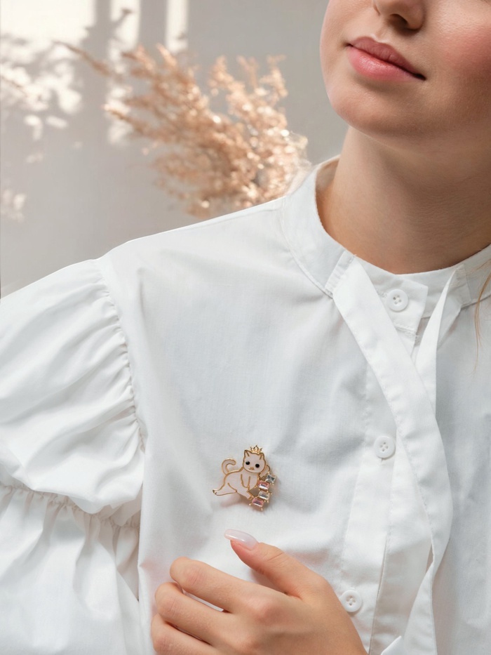 - Изысканный дизайн: сочетание эмали, полистоуна и страз создаёт объёмный и привлекательный образ кошечки с короной, который привлекает взгляды и вызывает восхищение.