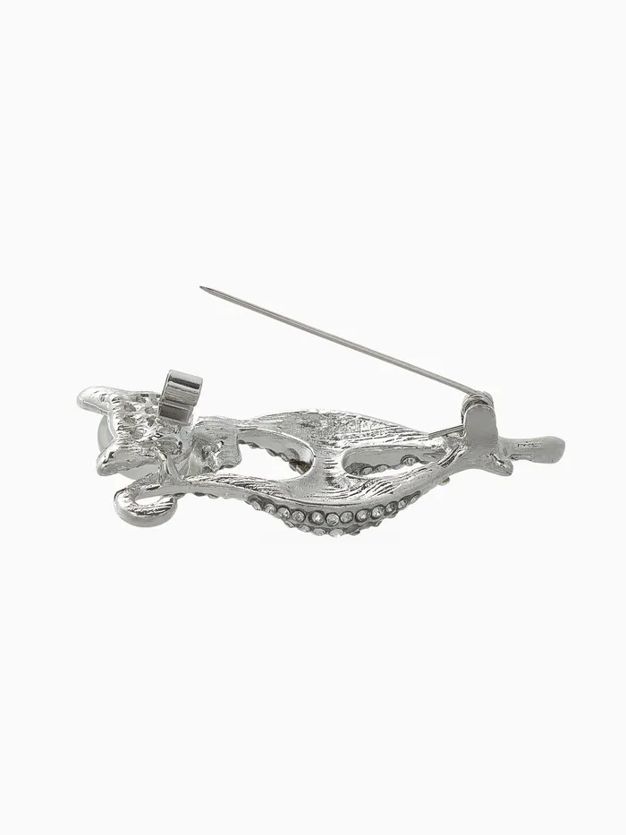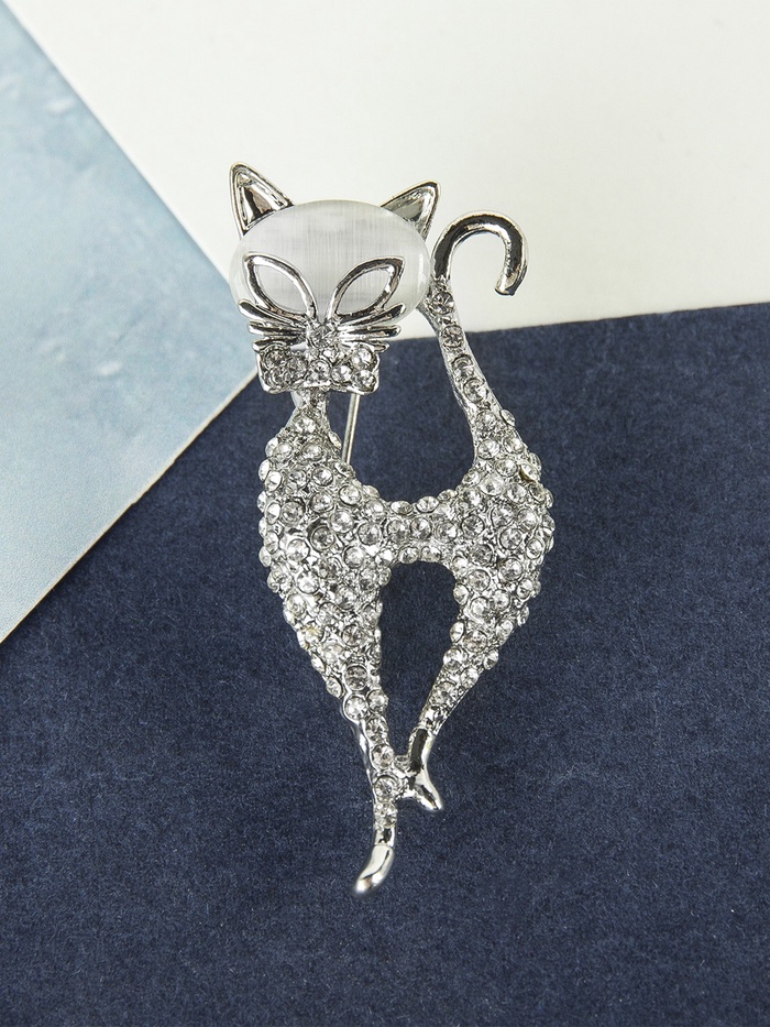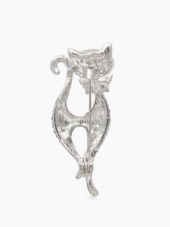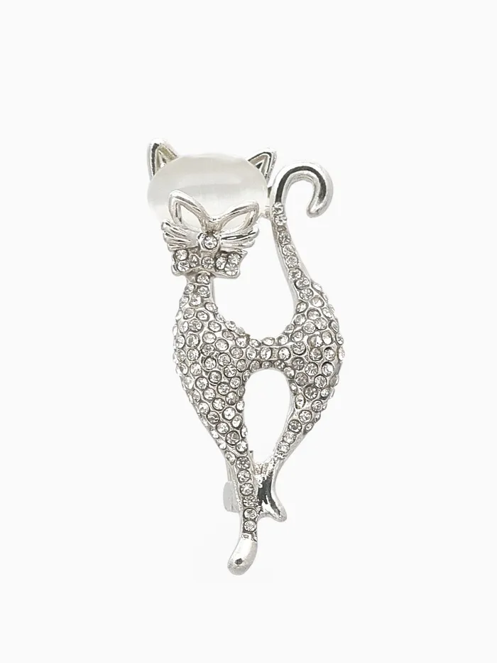 Сдержанная грация и лёгкий шарм — именно так можно описать эту брошь в виде кошки с бантом. Белоснежный камень, напоминающий кошачий глаз, в сочетании с серебристой фурнитурой создаёт образ, в котором сочетаются элегантность и игривость. Это украшение не просто дополнит образ, а придаст ему характер и настроение.