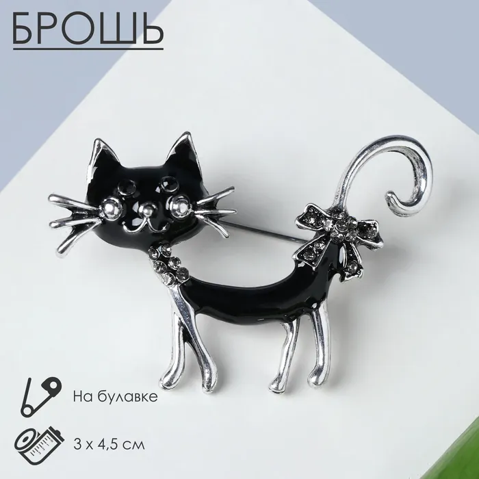 Брошь «Кошка» кокетливая с бантом, цвет чёрный в чернёном серебре — Характеристики