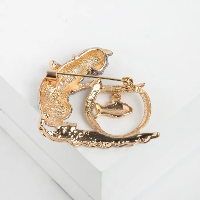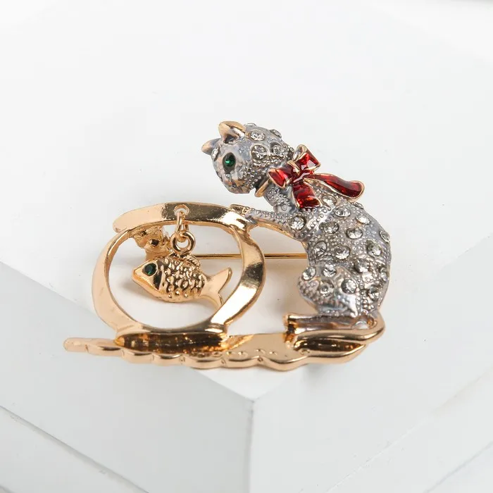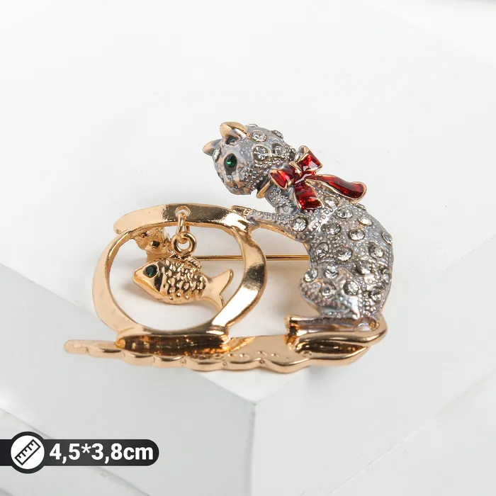 Откройте для себя оригинальную брошь в форме кошки с аквариумом, которая станет ярким акцентом вашего образа. С длиной 4,5 см и сочетанием серо-красных оттенков в золотой фурнитуре, она привлекает внимание и добавляет игривости любому наряду.