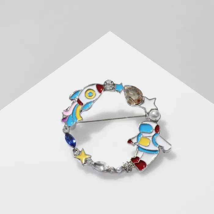 Миниатюрная брошь с космическим сюжетом воплощает в себе динамику и загадочность вселенной. Её разноцветное оформление на серебристом металлическом основании привлекает внимание и гармонично сочетается с любым стилем одежды, добавляя образу яркости и оригинальности.