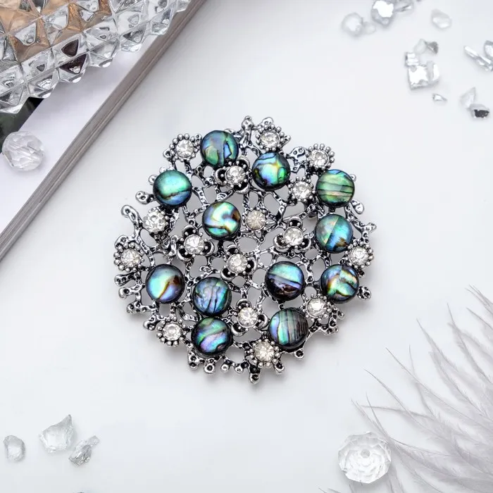 Основа из прочного металла с чернением придаёт украшению винтажный шарм и глубину цвета, а натуральная ракушка галиотис с переливами и вставки из страз и эпоксидной смолы создают эффект живого сияния, будто миниатюрный фейерверк природы. Универсальная тематика и элегантный дизайн делают брошь подходящим подарком для мамы, бабушки, дочери или внучки — близким людям, которые ценят утончённость и стиль.