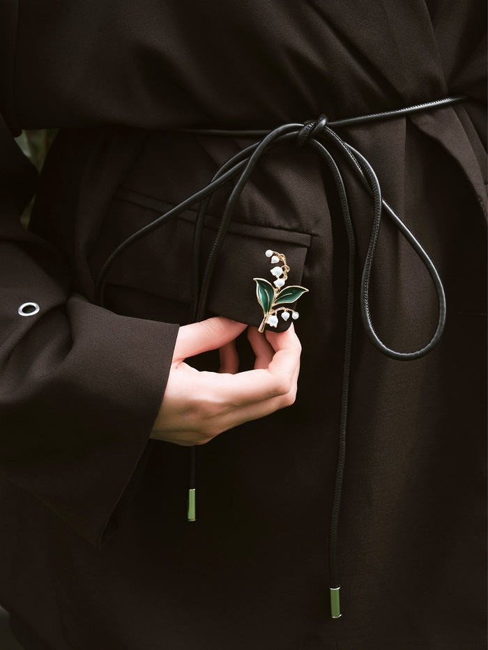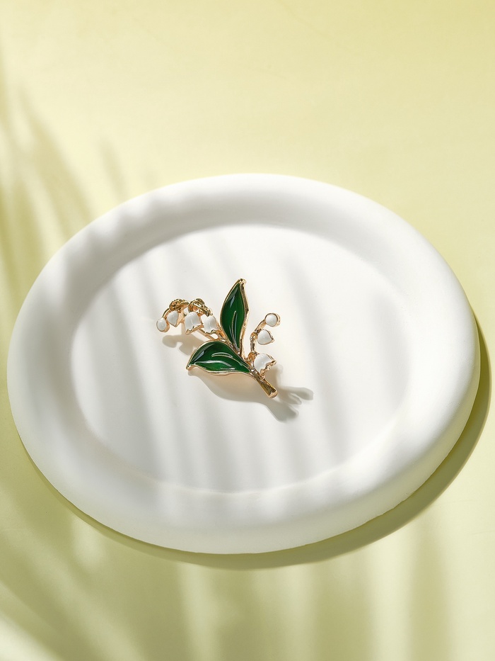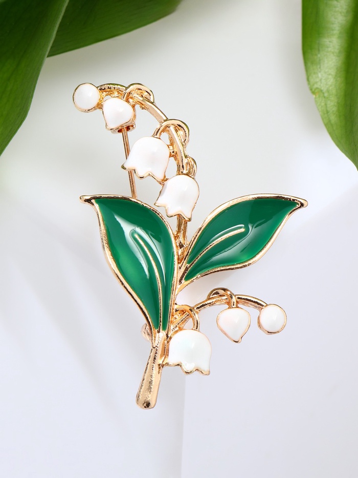 Нежность и свежесть весеннего утра воплощены в изящной броши с двумя веточками ландышей, выполненной в бело-зелёных тонах с золотистым основанием. Её длина в 5,2 см делает украшение заметным, но при этом лёгким и изящным, что позволяет гармонично дополнить любой женский образ.