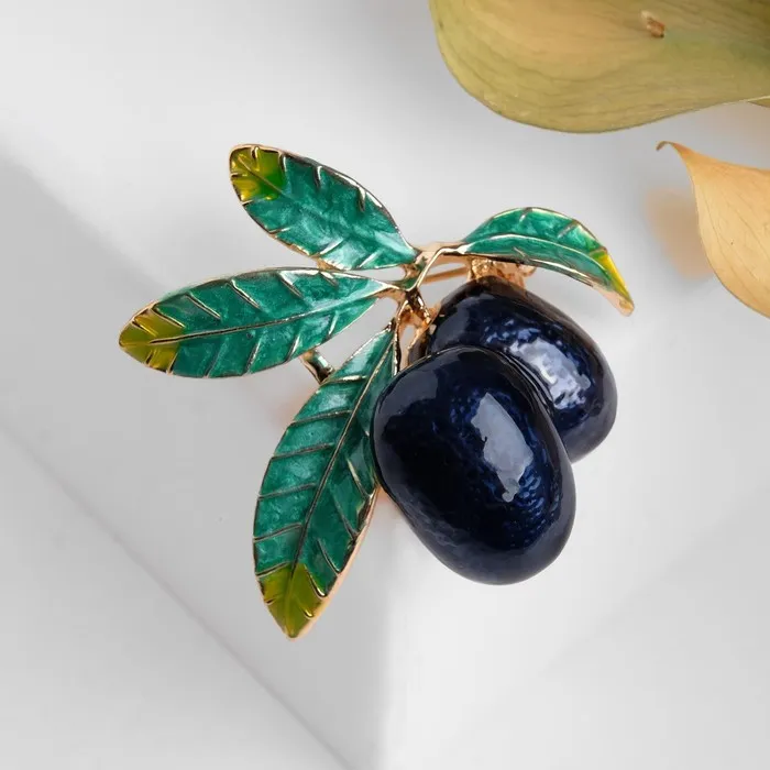 Изящная брошь в виде веточки с маслинами — это гармоничное сочетание природной красоты и утончённого стиля. Золотистый металлический каркас с яркими эмалевыми вставками создаёт живописный образ, который привлекает внимание и подчёркивает индивидуальность своей обладательницы.
