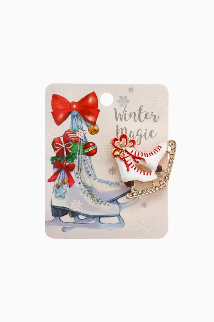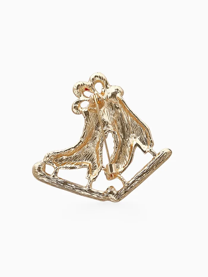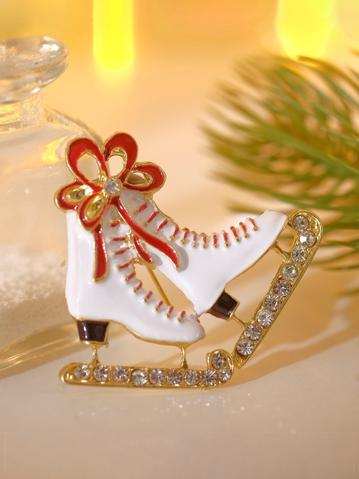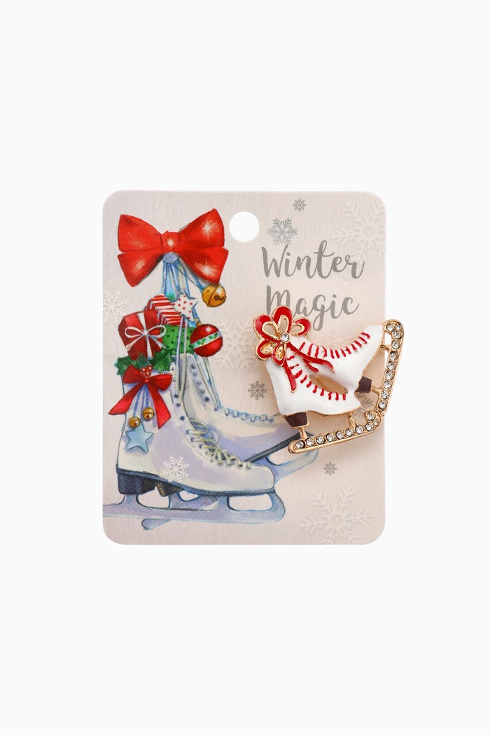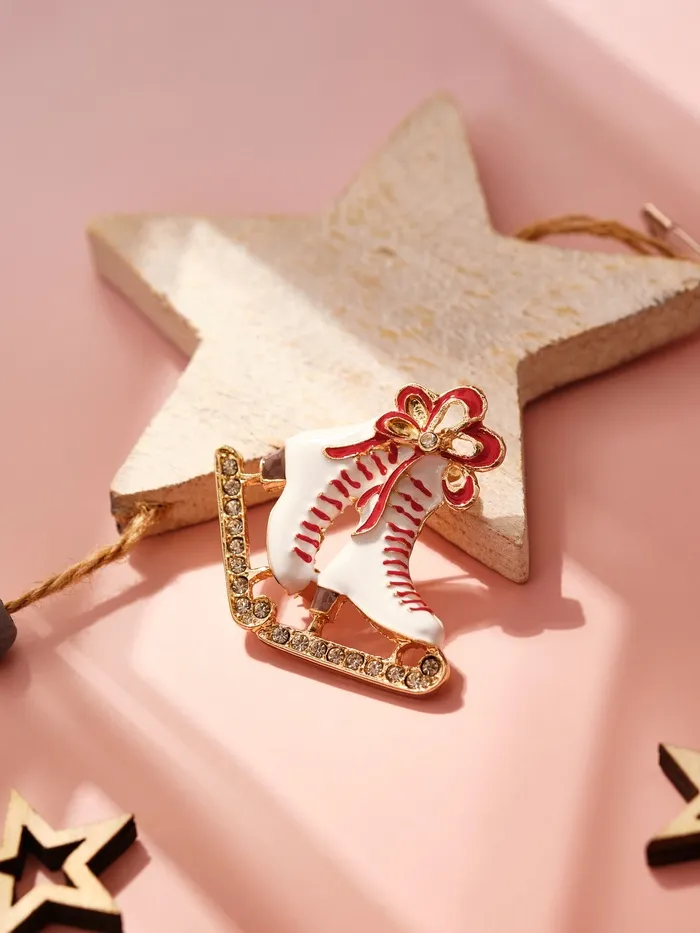 Брошь новогодняя «Коньки» с бантом, цвет красно-белый в золоте — Характеристики