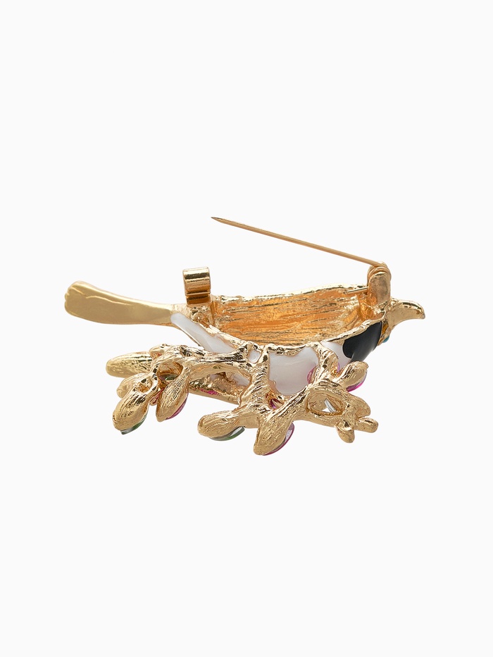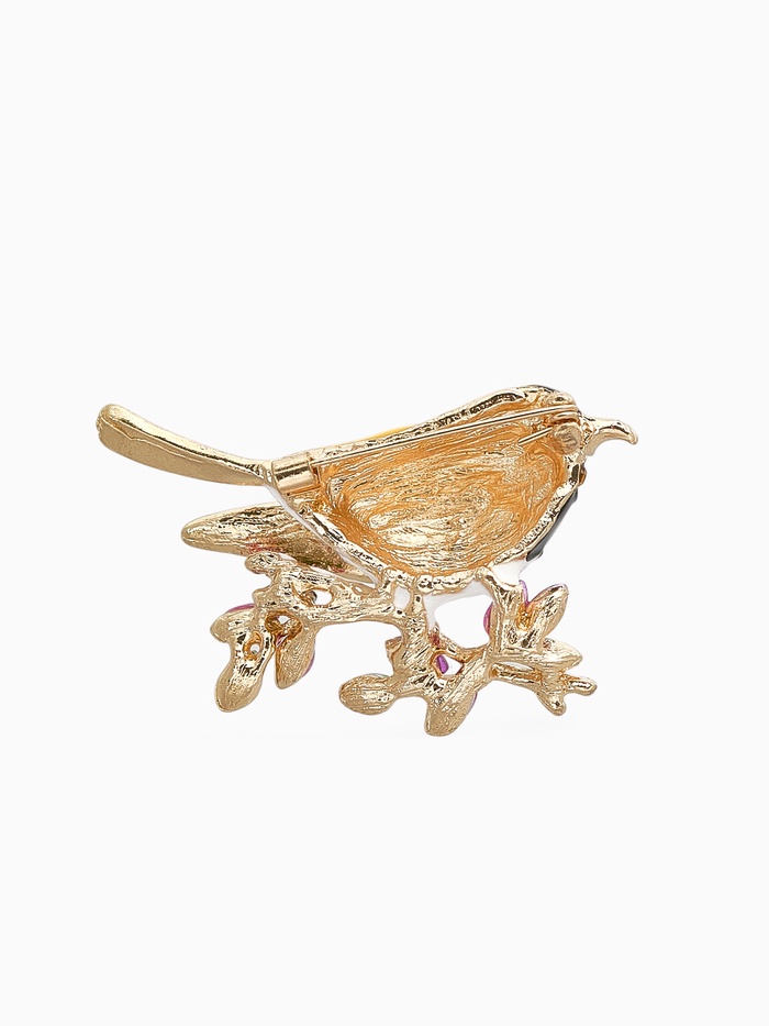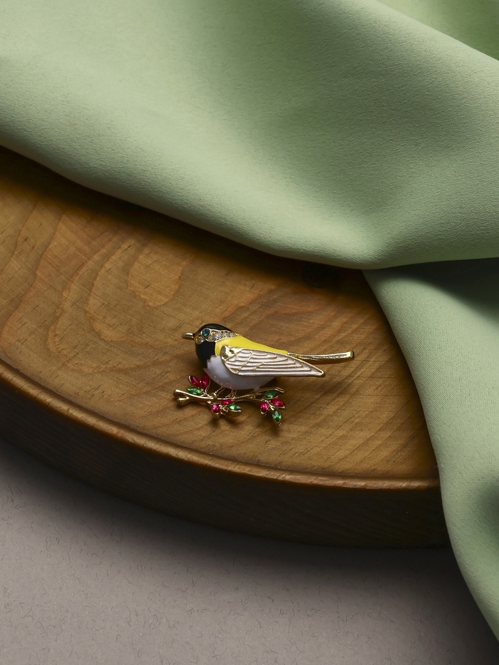 Изящная брошь с изображением птички-синички в золотистой оправе привнесёт в образ лёгкость и яркость. Её длина всего 4,5 см, что делает изделие универсальным аксессуаром для женщин любого возраста — от внучек до бабушек. Разноцветная эмаль, украшенная блеском страз и стеклянных вставок, придаёт броши живописность и выразительность.