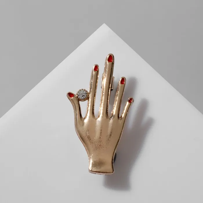 Брошь в виде изящной руки с маникюром, выполненная в красно-белой гамме с золотистыми акцентами, привлекает внимание своим оригинальным дизайном и выразительностью. Компактный размер 3,5 см делает украшение универсальным аксессуаром, который легко впишется в любой образ, добавляя ему нотку дерзости и стиля.